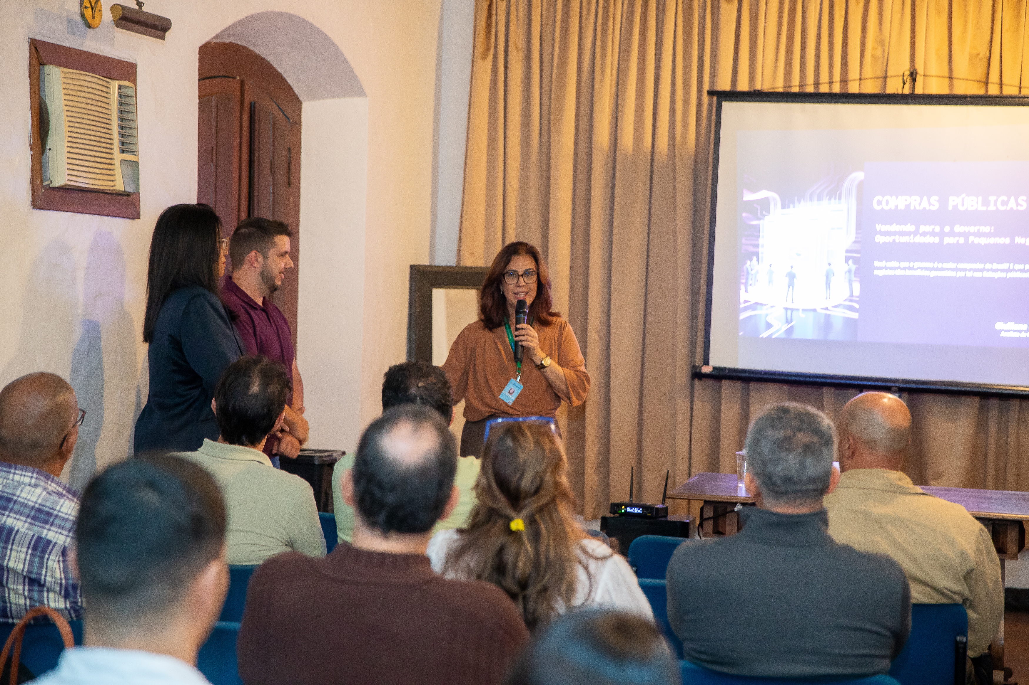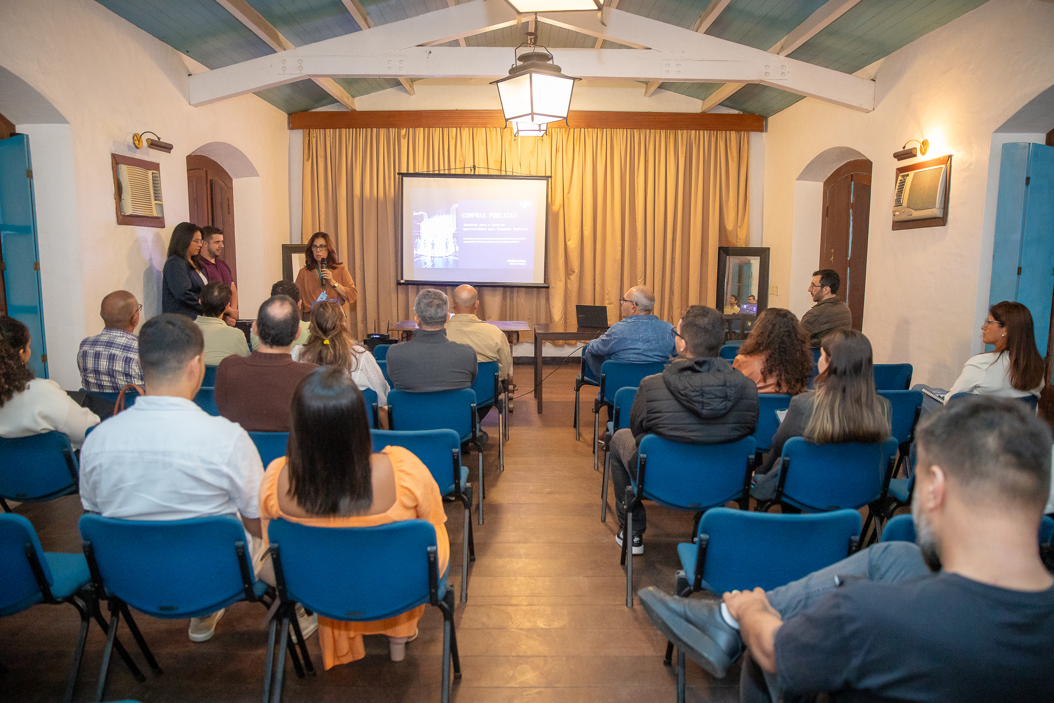#PraTodosVerem: imagens mostram uma sala de eventos com cadeiras azuis organizadas em fileiras, onde diversas pessoas assistem a uma apresentação sobre compras públicas. À frente, uma mulher fala ao microfone próxima a um telão com projeção, acompanhada por outros profissionais. O ambiente tem teto com vigas aparentes, paredes claras e iluminação amarelada. Participantes estão atentos e sentados, enquanto os apresentadores se posicionam próximos à tela. Fim da descrição.