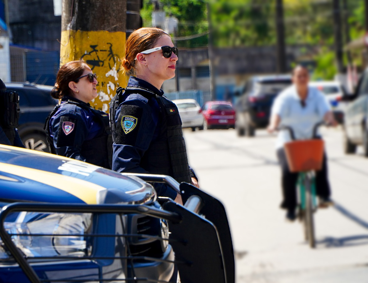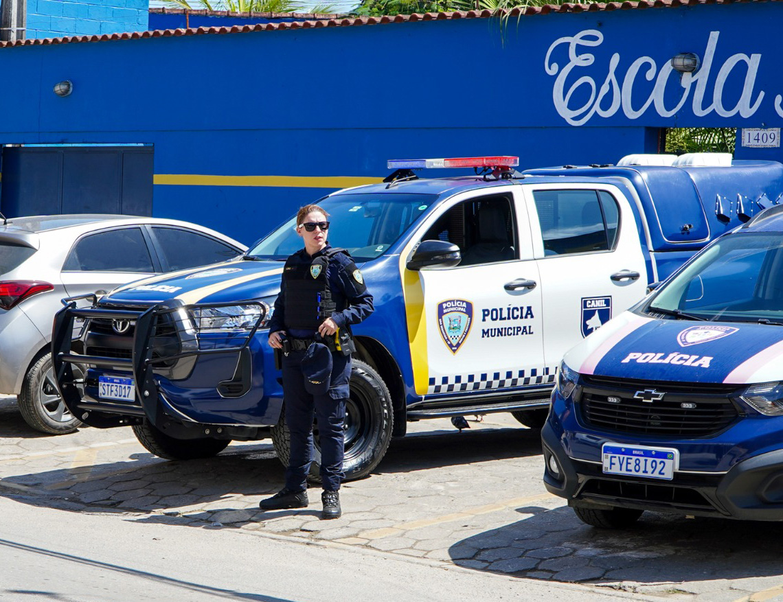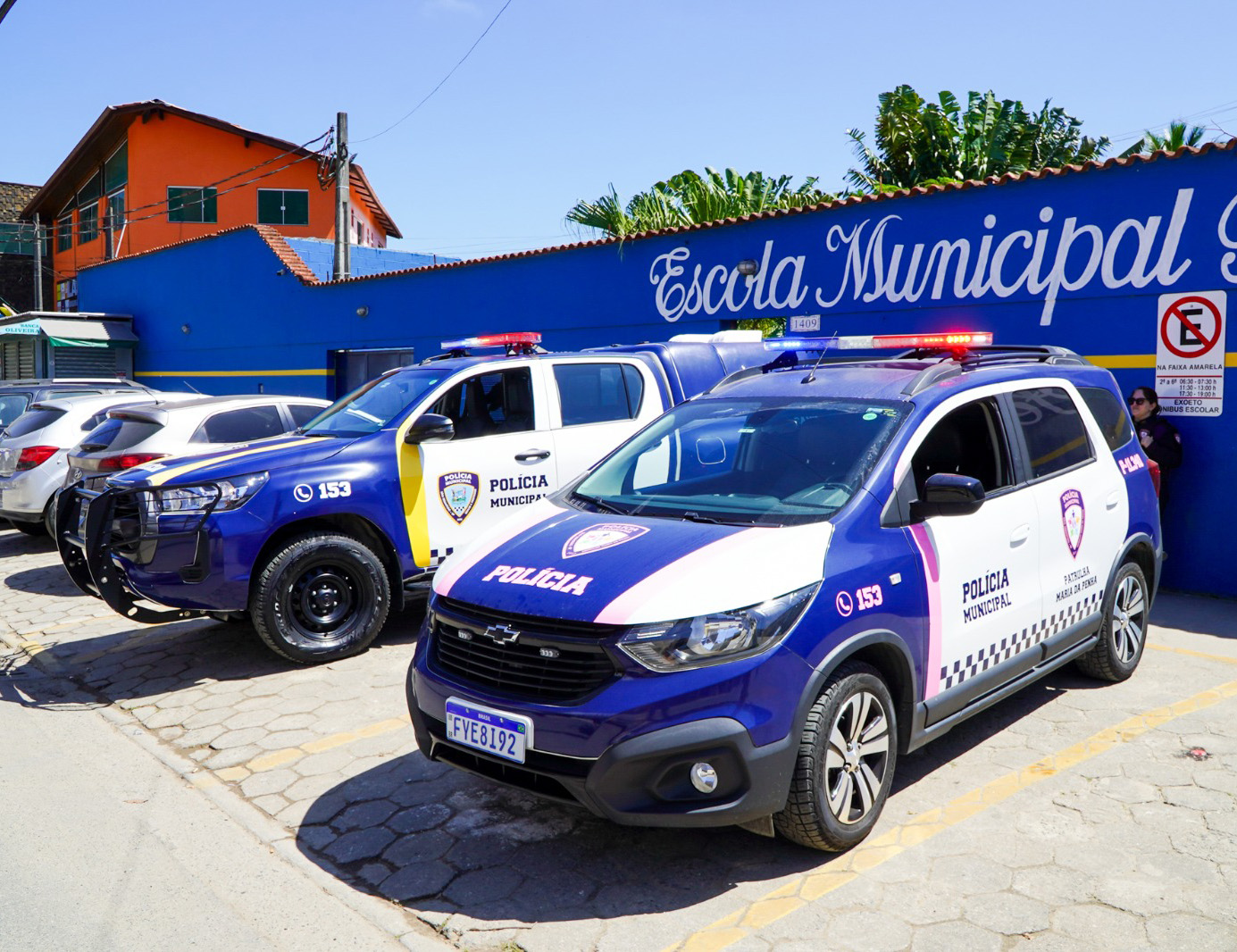 #PraTodosVerem: As imagens mostram a presença da Polícia Municipal em frente a uma escola pública de muro azul, identificada como Escola Municipal. Nas fotos, viaturas com as cores azul, branca e detalhes amarelos e rosa estão estacionadas, com luzes de emergência ligadas. Policiais municipais, usando uniforme azul-escuro, colete e óculos escuros, realizam patrulhamento e observam o movimento ao redor, garantindo a segurança na área escolar. Ao fundo, há veículos estacionados, pedestres e um ciclista passando pela rua. O dia está ensolarado e o céu limpo. Fim da descrição.