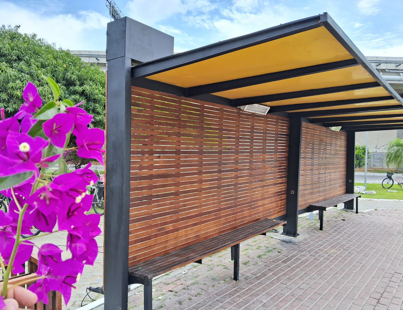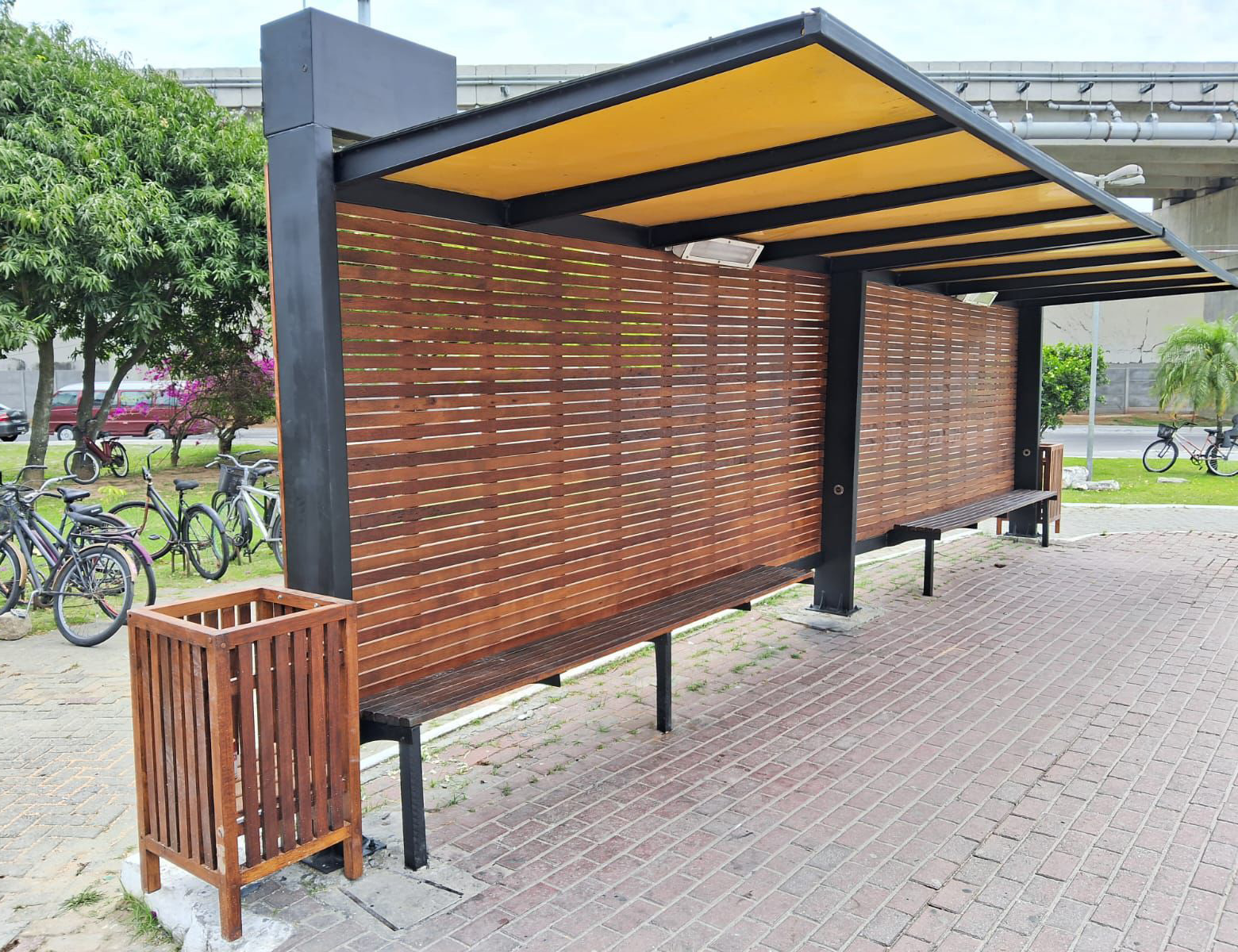 #ParaTodosVerem: Estrutura moderna de ponto de ônibus feita com madeira e metal, com cobertura amarela e bancos integrados. Ao lado, há uma lixeira de madeira. O ponto está instalado em uma área arborizada, com bicicletas estacionadas próximas e piso de blocos intertravados.