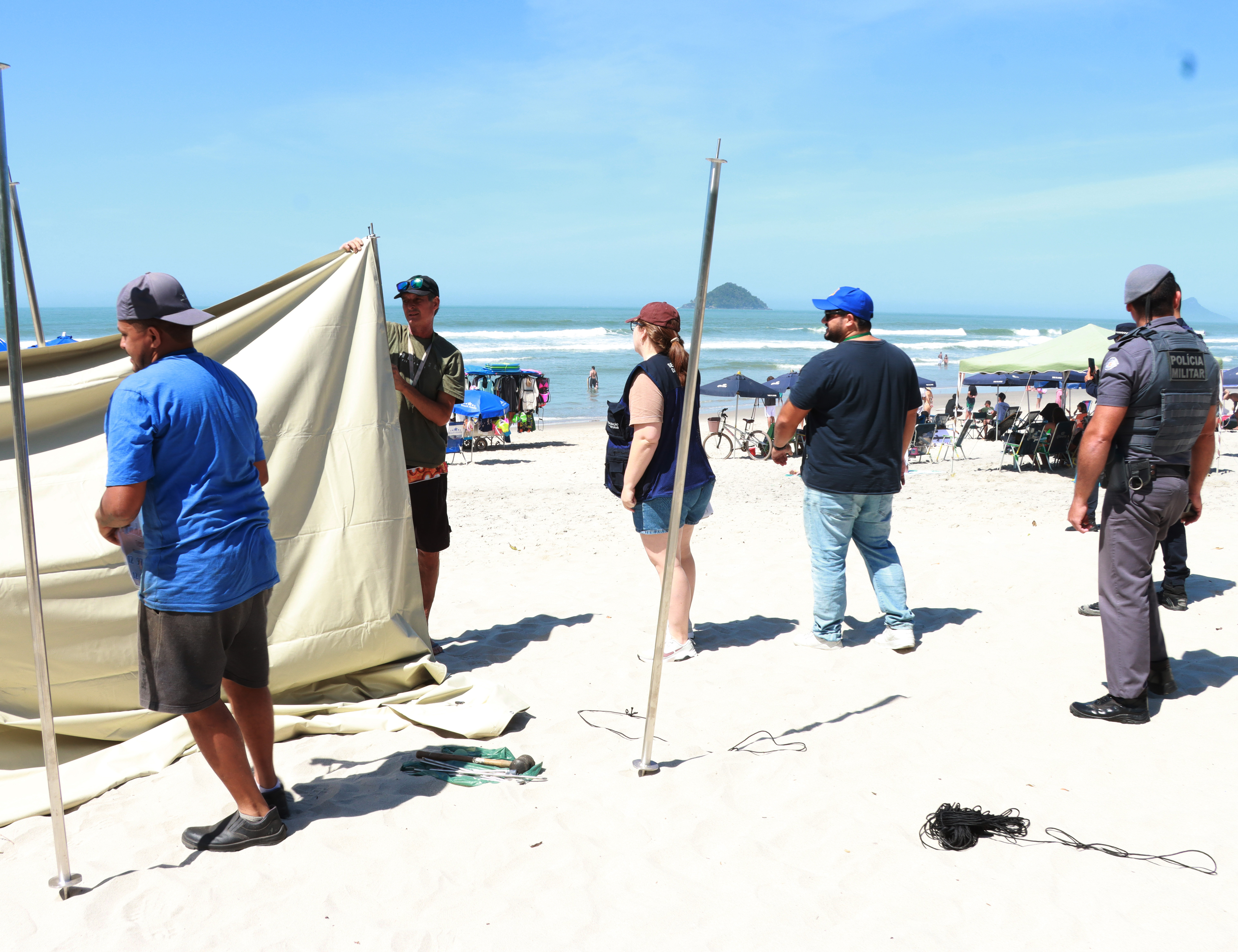 #PraTodosVerem: Sequência de quatro imagens mostra uma operação conjunta na praia em um dia ensolarado. Nas fotos, agentes da Guarda Civil Municipal, Polícia Militar e servidores municipais realizam fiscalizações na faixa de areia. Em uma das imagens, o grupo observa cadeiras e estruturas montadas sob um toldo; em outras, agentes e fiscais desmontam uma grande tenda instalada irregularmente, com o mar e banhistas ao fundo. As ações ocorrem de forma integrada e organizada, em ambiente de praia com barracas e guarda-sóis ao redor. Fim da descrição.