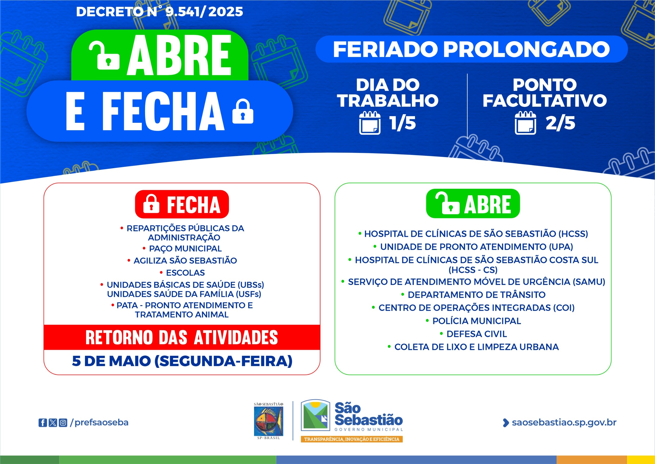 Em razão do feriado do Dia do Trabalho, comemorado em 1° de maio, e do ponto facultativo nesta sexta-feira (2/5), a Prefeitura de São Sebastião informa como será o funcionamento dos serviços públicos no período.