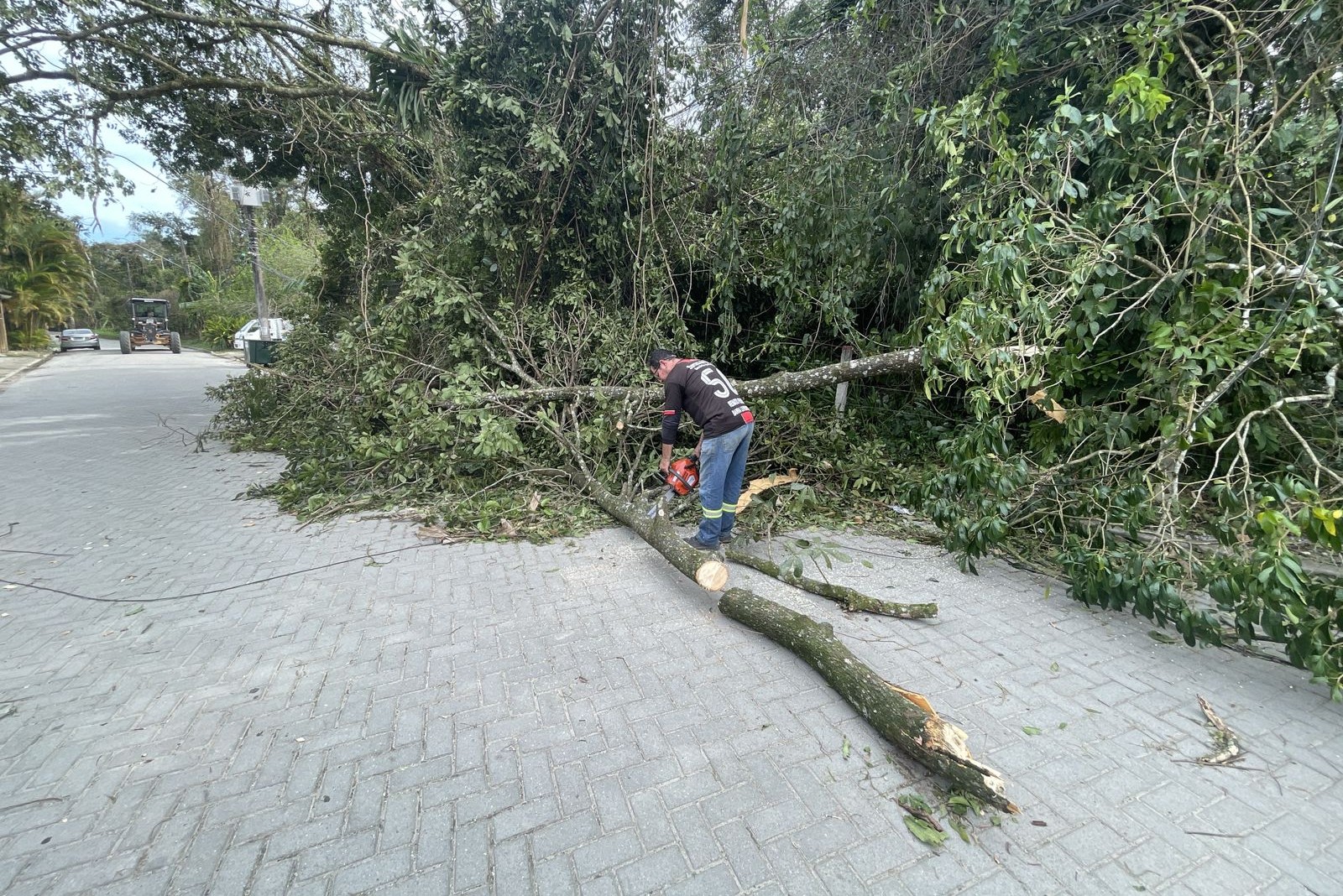 #PraTodosVerem: as quatro imagens retratam os impactos dos fortes ventos em São Sebastião e mostram as ações da Secretaria de Serviços Públicos (Sesep) para amenizar os danos do vendaval. Na maioria das imagens, os colaboradores da Prefeitura de São Sebastião estão vestidos de azul ou laranja, retirando árvores caídas em vias dos bairros do município. Fim da descrição.
