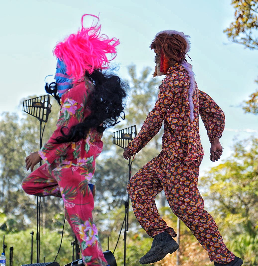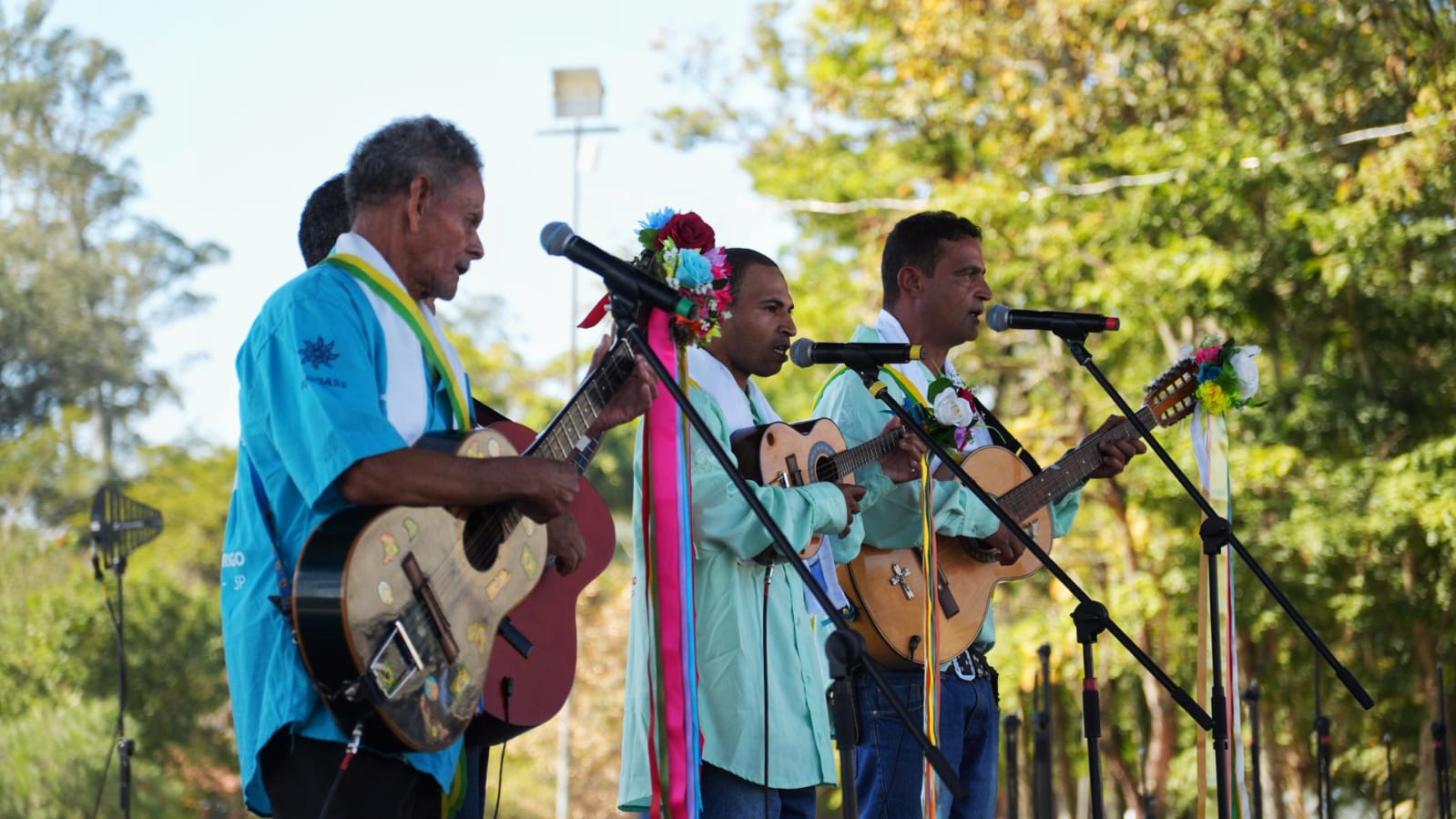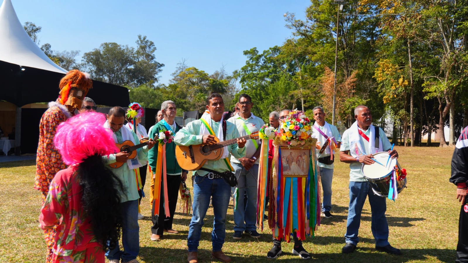 #PraTodosVerem: pessoas participam de uma tradicional celebração cultural ao ar livre, em área gramada com árvores ao fundo. Homens tocam instrumentos como violão, cavaquinho e tambor, usando faixas coloridas e trajes típicos. Há também personagens com fantasias coloridas e máscaras, dançando com alegria. Um estandarte ornamentado com fitas e flores está presente, representando o grupo folclórico. Crianças e adultos acompanham a festividade, que acontece em clima de confraternização e preservação das tradições populares. Fim da descrição.
