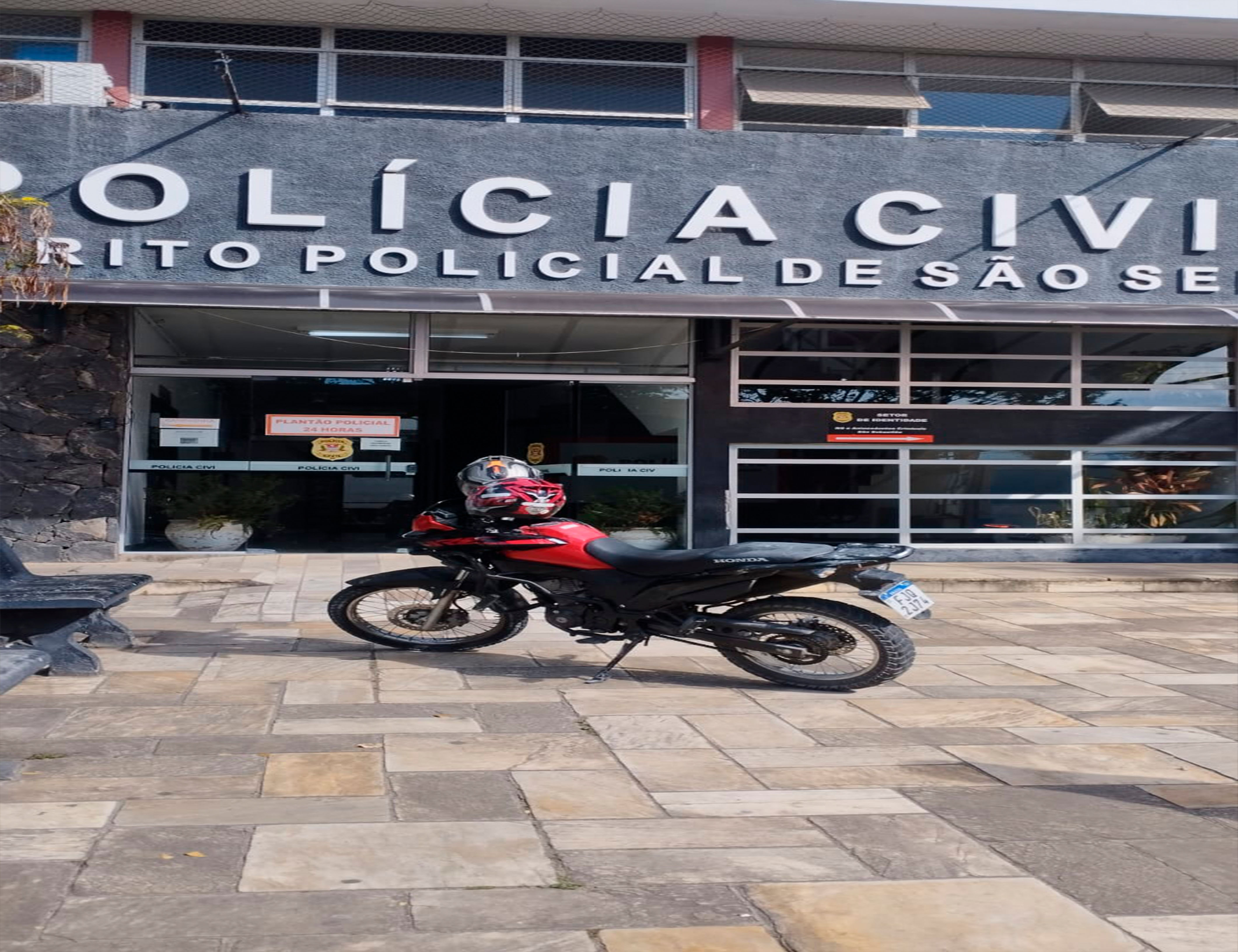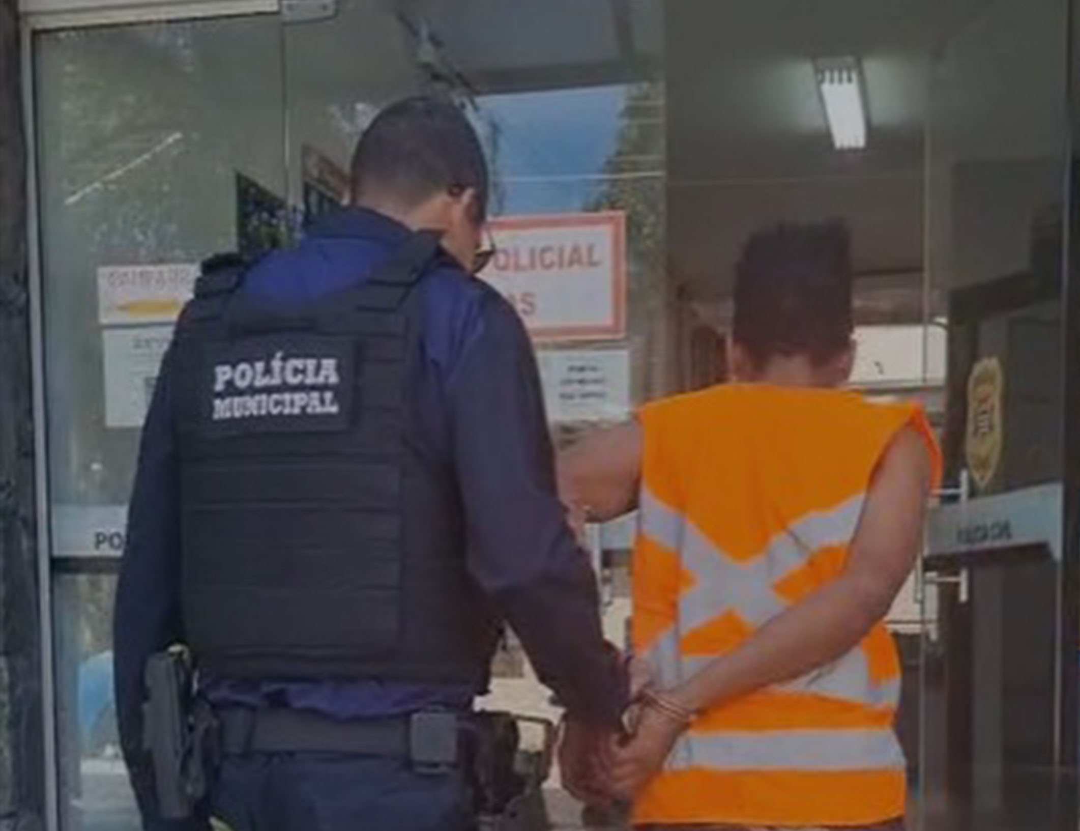 #PraTodosVerem: Na primeira imagem, um agente da Polícia Municipal, de uniforme azul escuro e colete preto com a inscrição “Polícia Municipal” nas costas, conduz um homem de colete laranja fluorescente, algemado, para dentro de uma delegacia. Eles aparecem de costas, entrando por uma porta de vidro. Na segunda imagem, fachada do prédio da Polícia Civil de São Sebastião, com letreiro em destaque na parte superior escrito “Polícia Civil – Distrito Policial de São Sebastião”. Em frente ao prédio, está estacionada uma motocicleta vermelha com capacete apoiado no retrovisor. Fim da descrição.