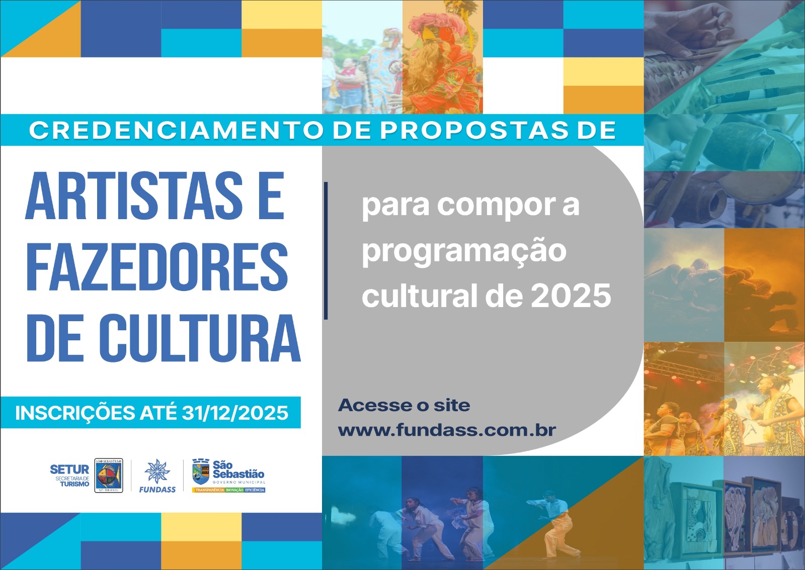 #PraTodosVerem: Card com fundo colorido e fotos de apresentações artísticas. Texto: “Credenciamento de propostas de artistas e fazedores de cultura para compor a programação cultural de 2025. Inscrições até 31/12/2025. Acesse o site www.fundass.com.br”. Logotipos da SETUR, Fundass e Prefeitura de São Sebastião. Fim da descrição.