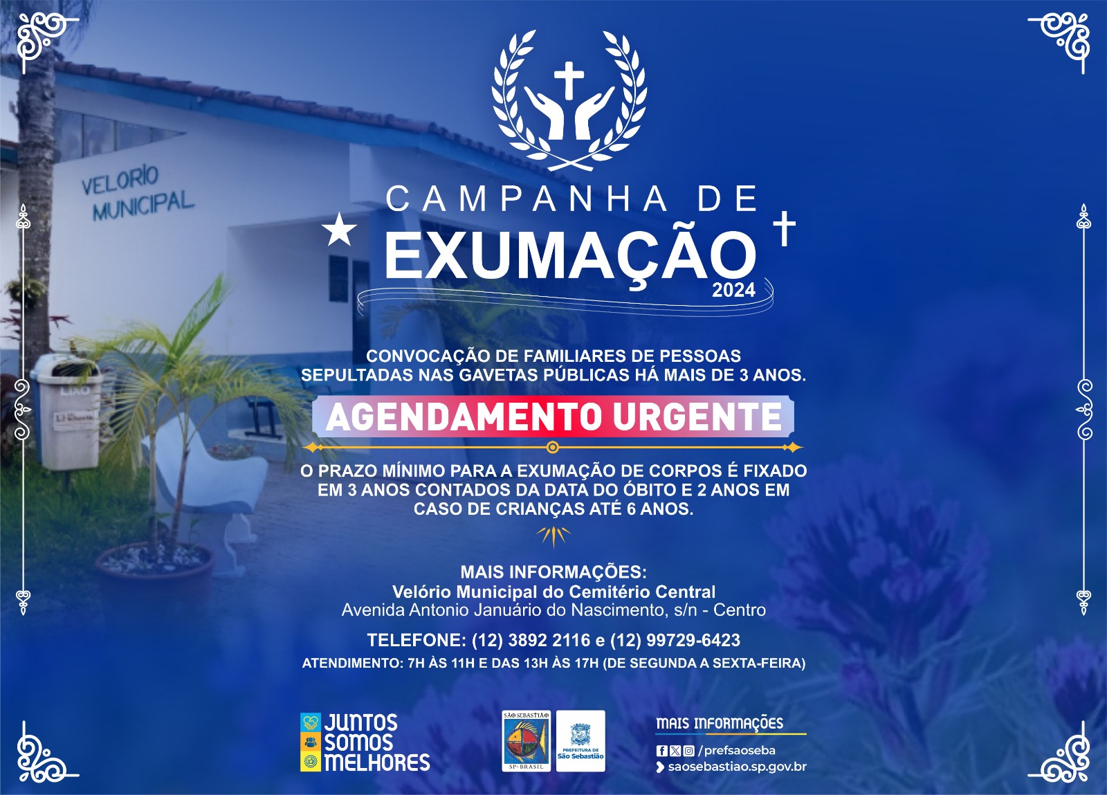 A Prefeitura de São Sebastião pede que as famílias compareçam, com a máxima urgência, ao cemitério para agendamento da exumação, tendo em vista que é preciso efetuar a transferência dos despojos mortais para ossuário coletivo ou urnas perpétuas.