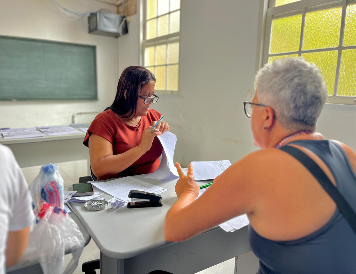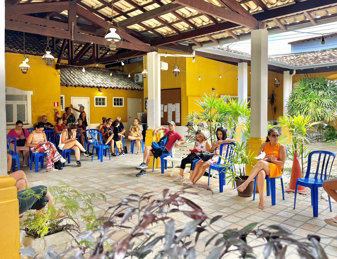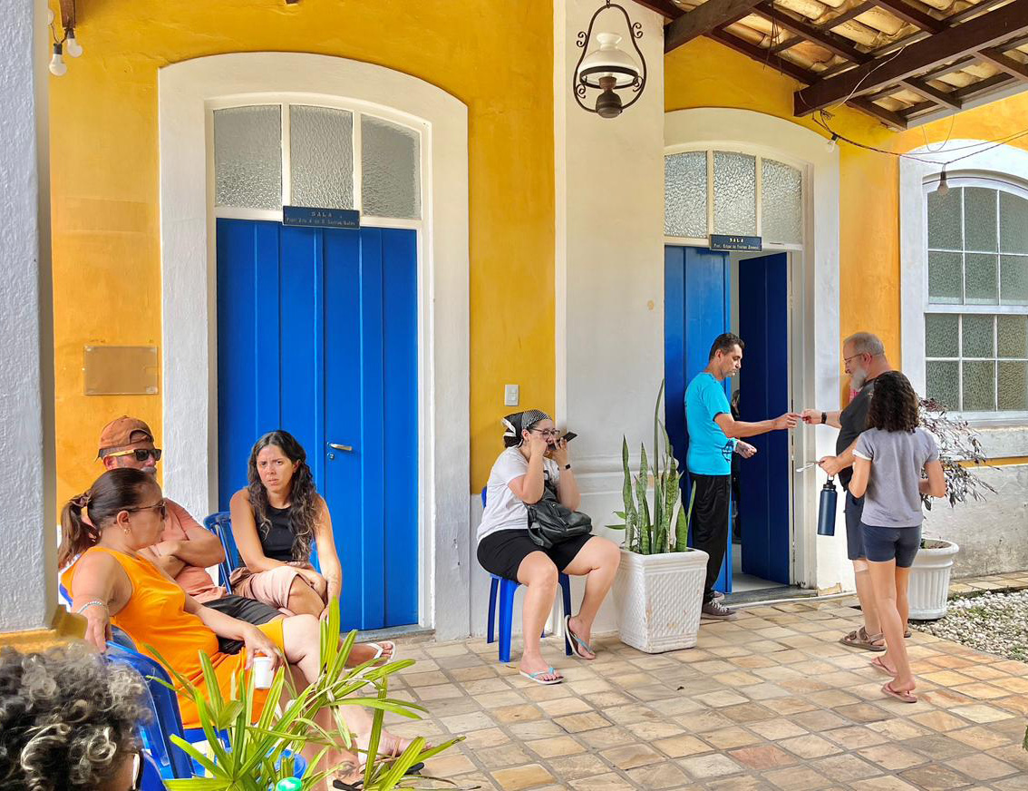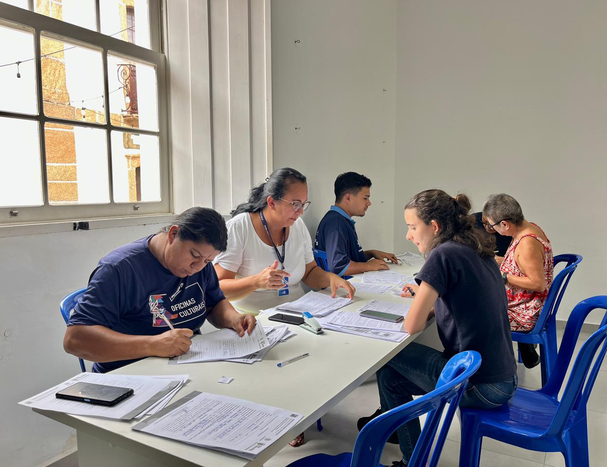 #PraTodosVerem: Sequência de fotos mostra a Casa da Cultura durante as inscrições para oficinas culturais. Na primeira imagem, pessoas aguardam sentadas no pátio do prédio, com paredes amarelas e portas azuis. Na segunda, uma atendente orienta uma moradora enquanto confere documentos sobre a mesa. Na terceira, equipe e participantes preenchem formulários e organizam papéis durante o processo de inscrição em uma sala iluminada por grandes janelas. Fim da descrição.