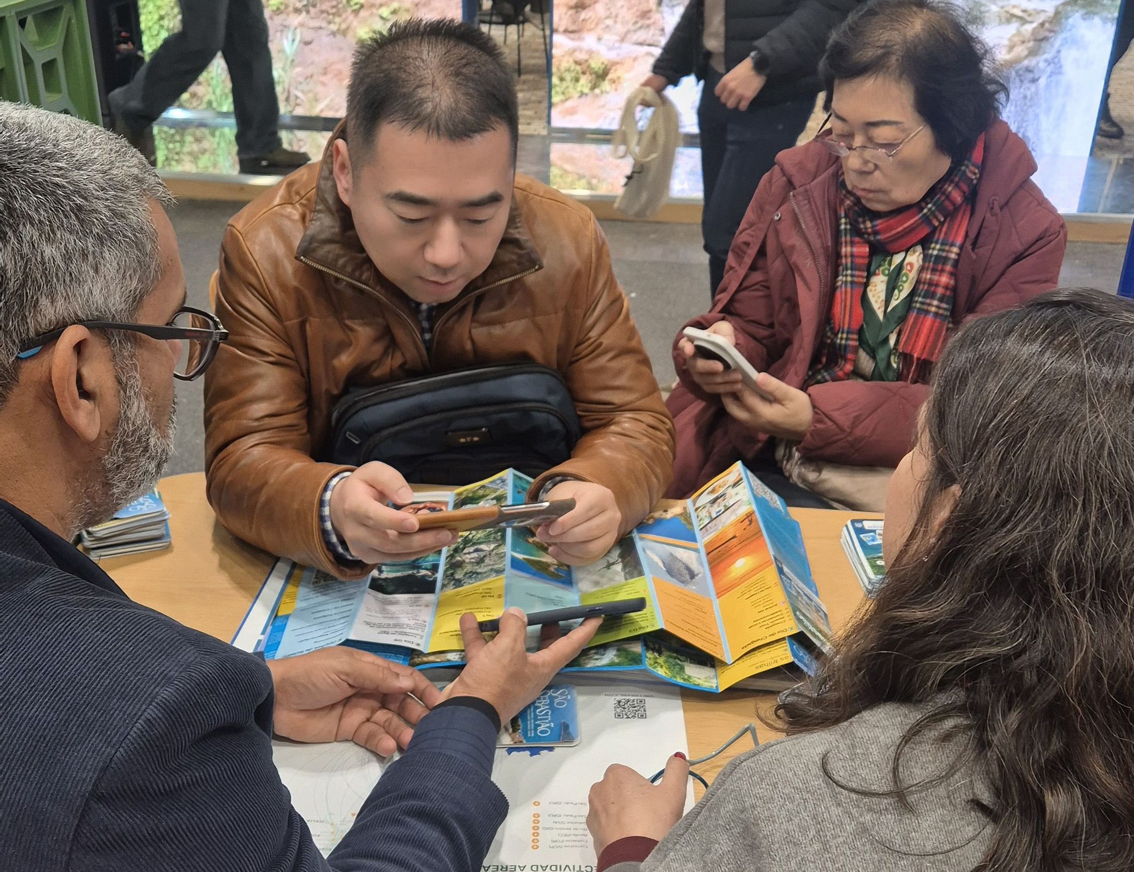 #PraTodosVerem: Imagens mostram atendimentos no estande de São Sebastião durante uma feira de turismo FITUR. Representantes da Setur conversam com visitantes de diferentes países, apresentando mapas, folhetos e um catálogo com paisagens e atrativos naturais do município. As cenas destacam o interesse do público e a troca de informações sobre São Sebastião. Fim da descrição.