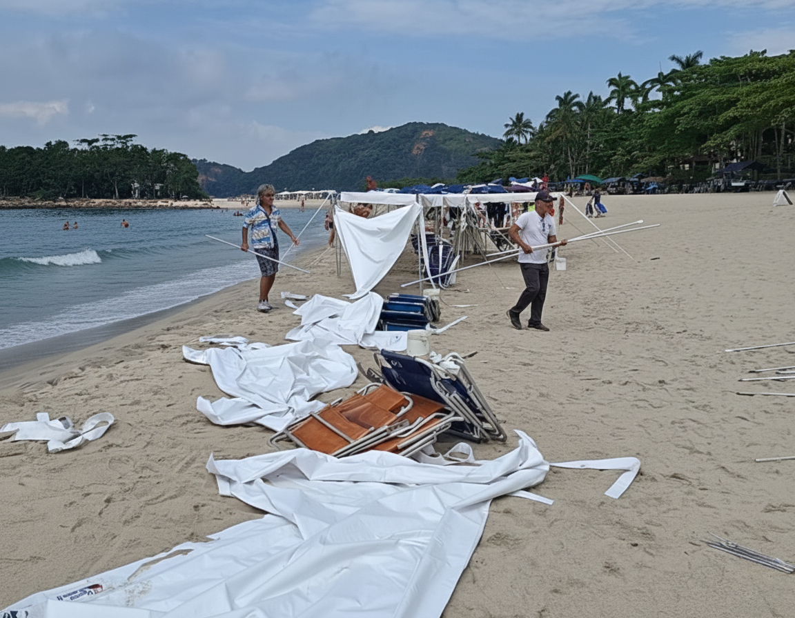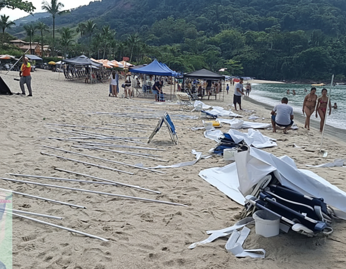 Em outra frente da mesma operação, a equipe apreendeu sete gazebos de cor azul de um infrator não identificado. Um incidente foi registrado durante o transporte, quando funcionários responsáveis pela montagem irregular subtraíram quatro das sete barracas que já estavam no veículo da prefeitura. O material remanescente foi encaminhado ao depósito da Regional de Boiçucanga.