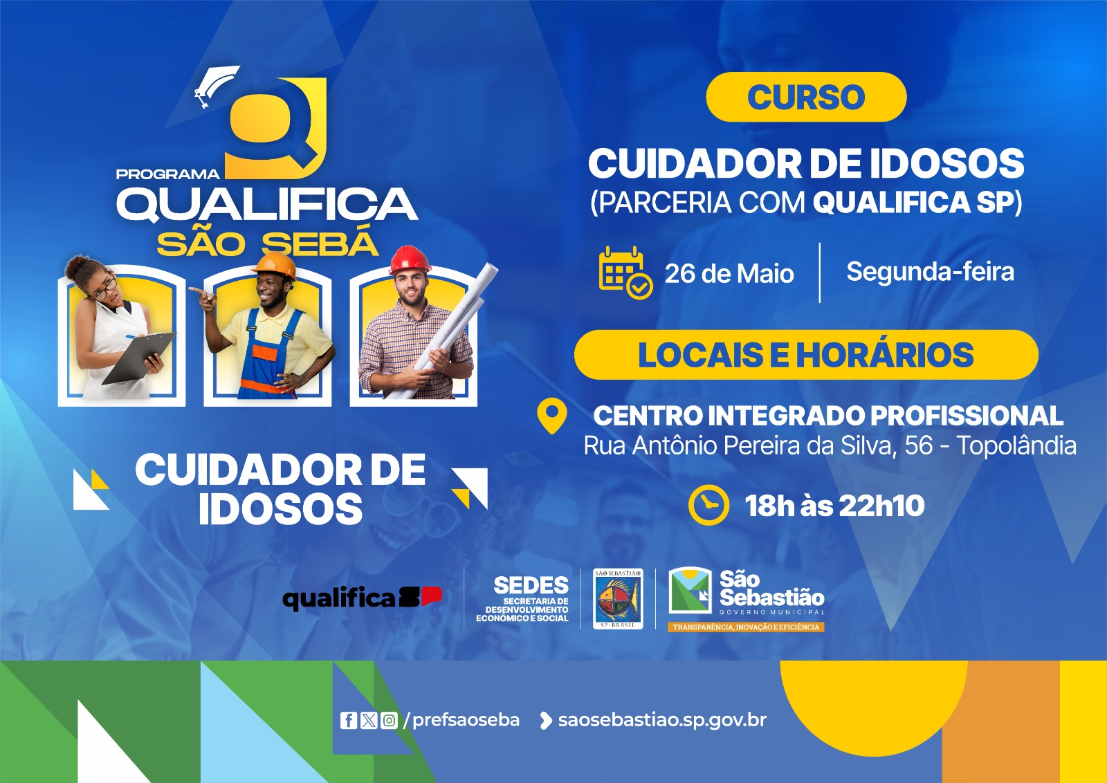 A Prefeitura de São Sebastião, em parceria com a Secretaria de Desenvolvimento Econômico (SDE) do Governo do Estado de São Paulo, está com inscrições abertas para o curso gratuito de Cuidador de Idosos com Inclusão Digital, oferecido pelo programa Qualifica SP – Novo Emprego.