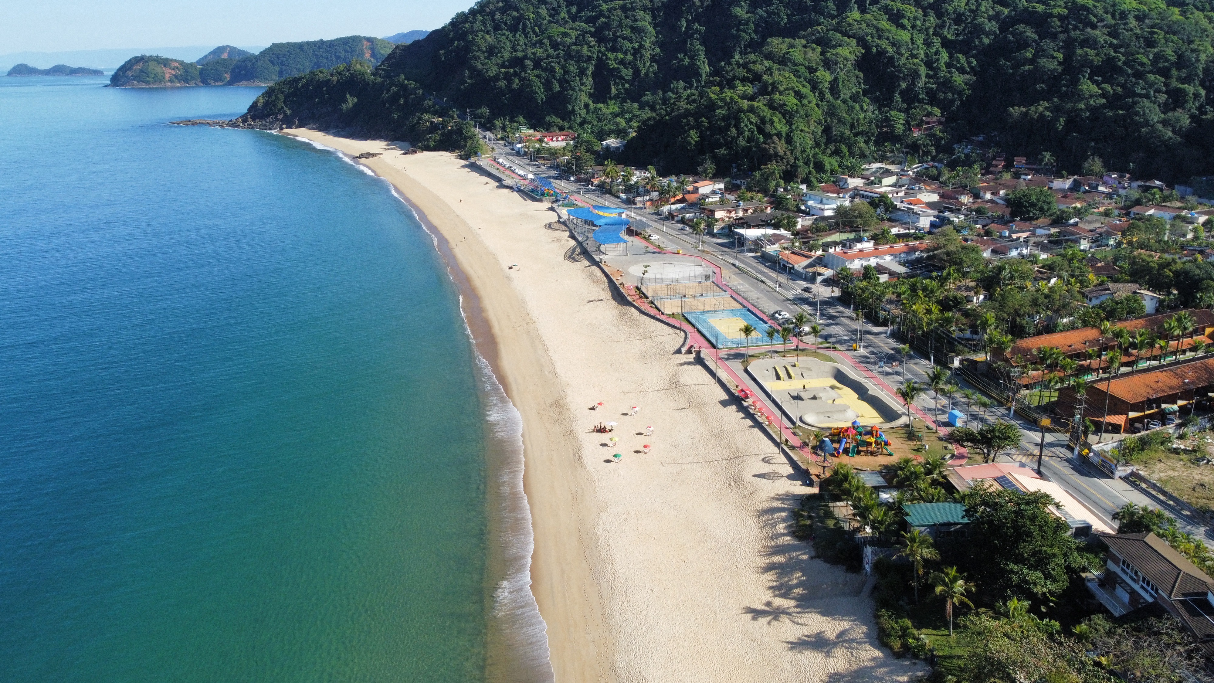 #PraTodosVerem: imagem aérea da Praça Pôr do Sol, na praia de Boiçucanga. Fim da descrição.