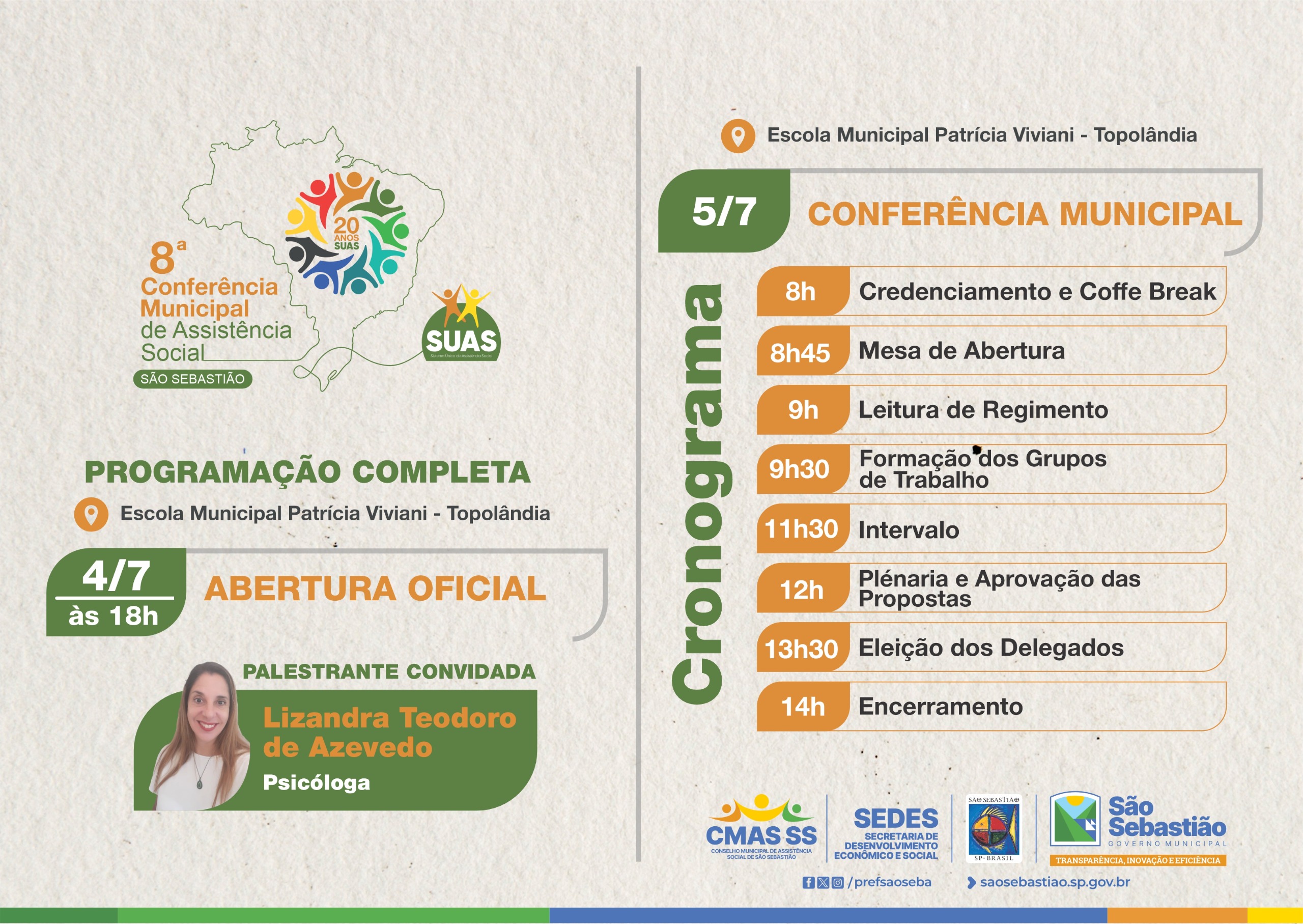 #PraTodosVerem: Card com fundo claro apresenta informações sobre a 8ª Conferência Municipal de Assistência Social de São Sebastião, comemorando os 20 anos do SUAS. O evento acontece na Escola Municipal Patrícia Viviani, no bairro Topolândia. A abertura oficial será no dia 4 de julho, às 18h, com palestra da psicóloga Lizandra Teodoro de Azevedo. Ao lado, a programação do dia 5 de julho: início às 8h com credenciamento e coffee break, seguido de mesa de abertura, leitura do regimento, formação dos grupos de trabalho, intervalo, plenária com aprovação das propostas, eleição dos delegados e encerramento às 14h. Abaixo, logos da CMAS SS, Sedes e Prefeitura de São Sebastião. As imagens seguintes mostram reuniões com participação ativa da comunidade: adultos e crianças em salas com cadeiras dispostas em círculo ou fileiras, interagindo com palestrantes e mediadores em espaços com quadros, cartazes e cortinas azuis. Fim da descrição.