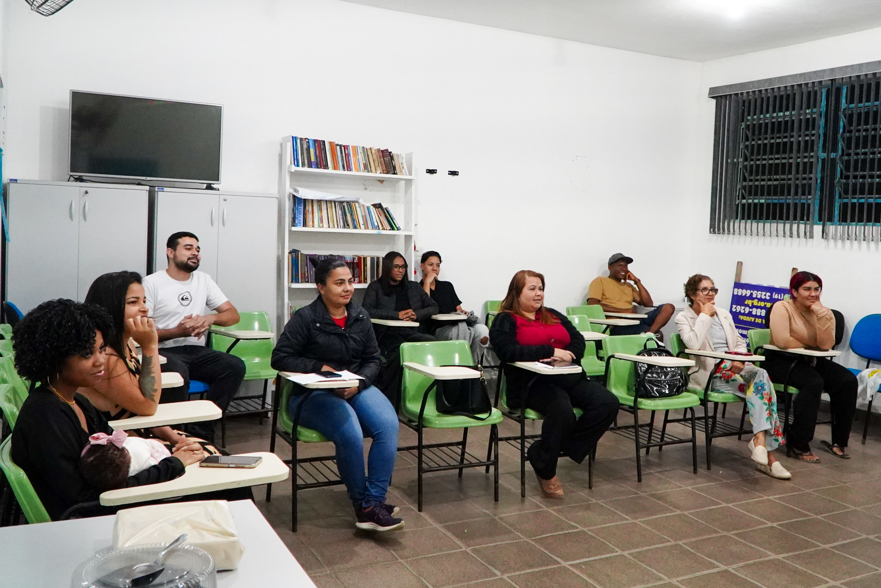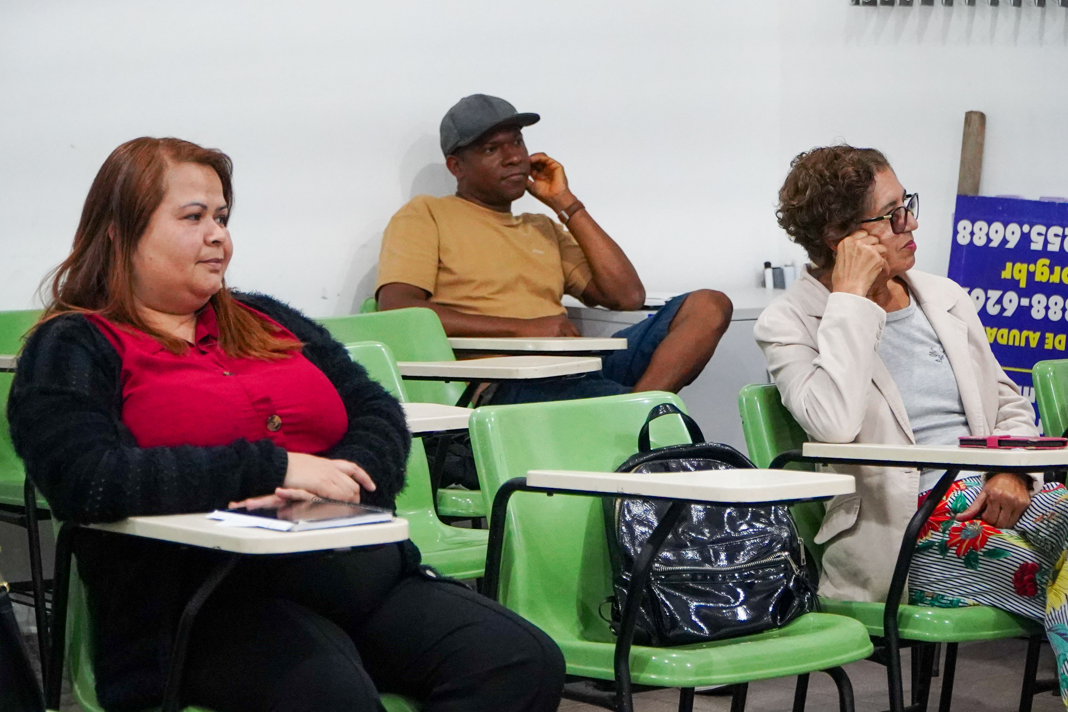#PraTodosVerem: rês fotos mostram uma sala de aula com adultos sentados em carteiras verdes ouvindo um homem de camiseta branca que fala em pé. As pessoas estão atentas, algumas anotando. Há estante com livros, janelas com persianas.