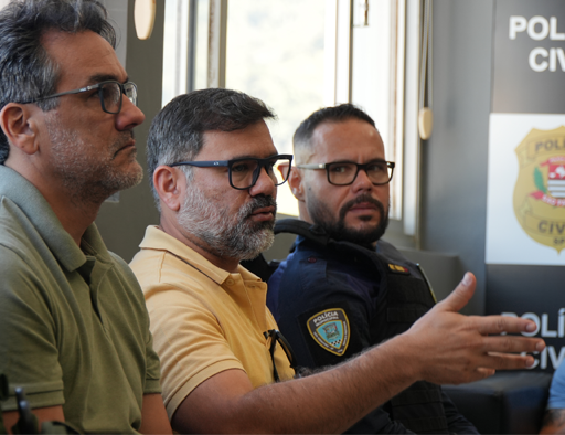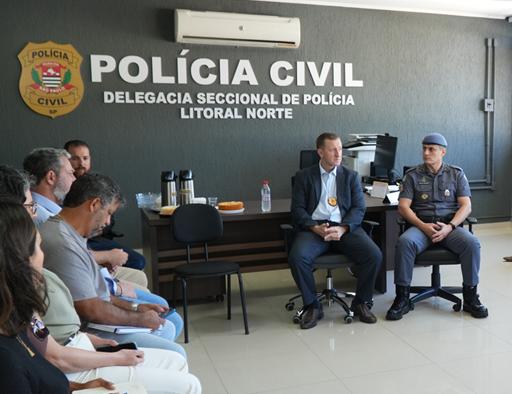 #PraTodosVerem: As imagens mostram uma reunião realizada na Delegacia Seccional de Polícia do Litoral Norte, em São Sebastião. Em uma sala com paredes cinzas e o brasão da Polícia Civil estampado, policiais civis, policiais militares e representantes civis participam do encontro. Algumas fotos destacam os participantes sentados em roda, atentos às falas, enquanto outras mostram momentos de discussão e troca de ideias. Em uma das imagens, todos posam juntos para a foto oficial, formando uma fileira em frente ao painel com o logotipo da Polícia Civil. O ambiente é formal e transmite o objetivo de integração entre forças de segurança e comunidade.