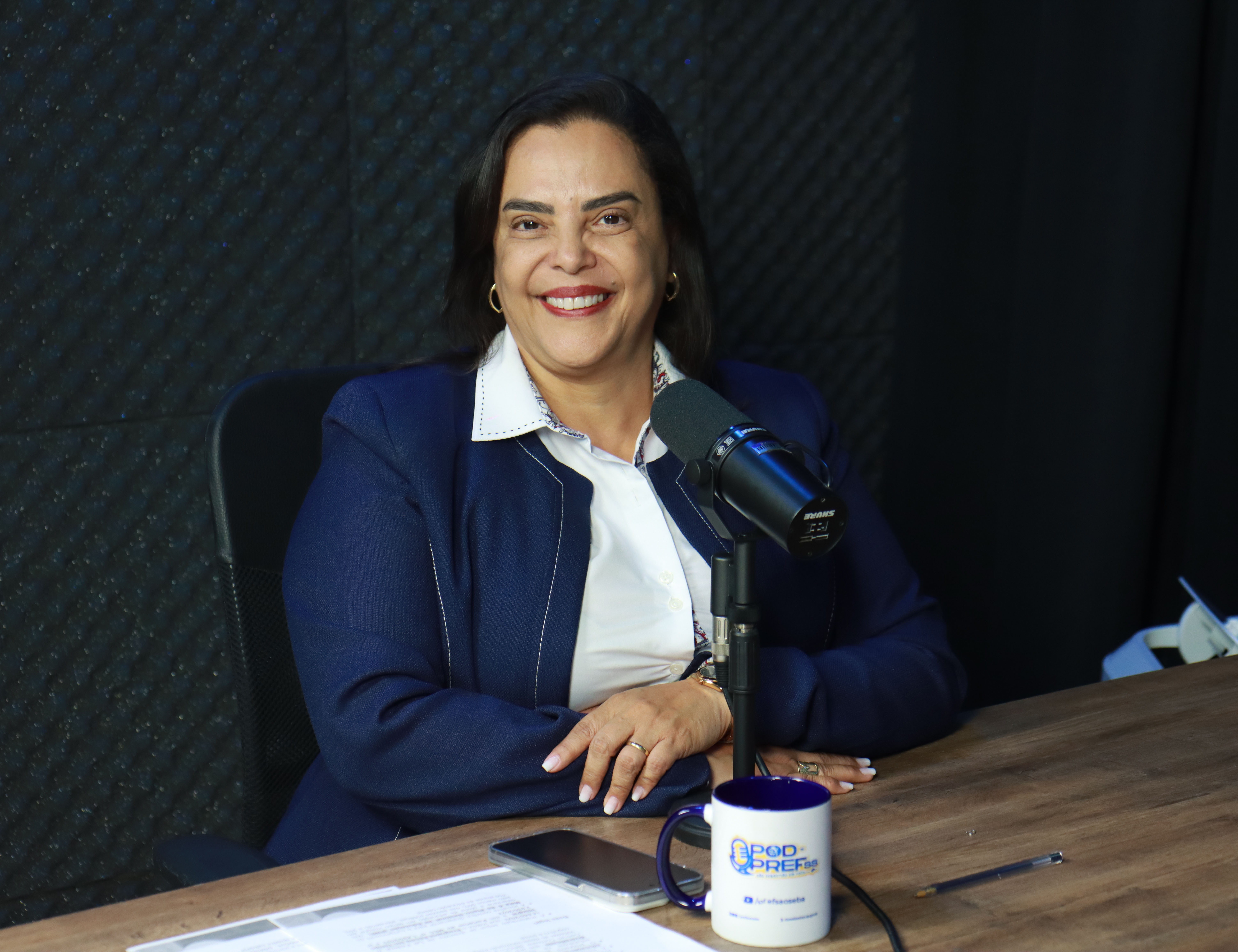 #PraTodosVerem: Imagens mostram a secretária de Educação de São Sebastião, Marta Braz, durante a gravação do episódio do Pod da PrefSS, em um bate-papo descontraído sobre as ações e avanços da rede municipal de ensino. Fim da descrição.