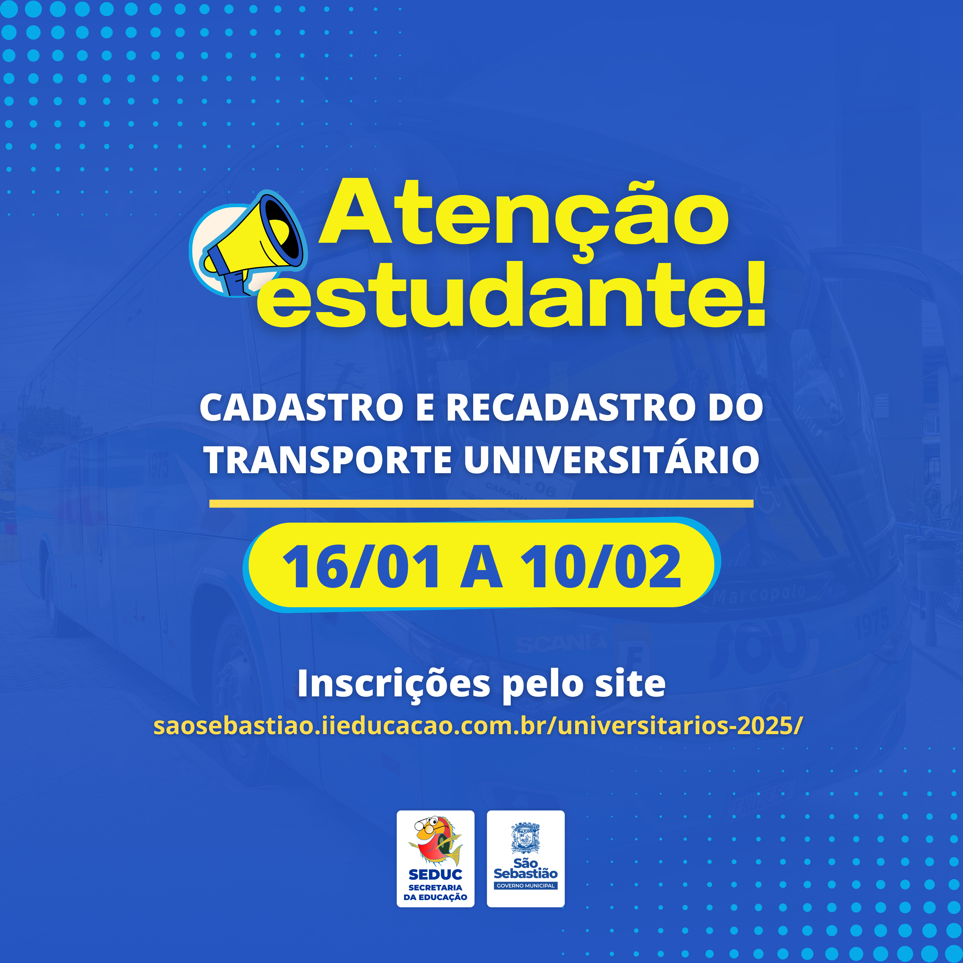 A Prefeitura de São Sebastião, por meio da Secretaria da Educação, publicou o Edital nº 002/2025, convocando estudantes universitários para cadastro e recadastro no benefício do transporte escolar, que inclui modalidades municipal, intermunicipal e reembolso de passagens. As inscrições, que foram abertas no último dia 16 de janeiro, seguem até o próximo dia 10 de fevereiro de 2025, e devem ser realizadas exclusivamente de forma on-line.