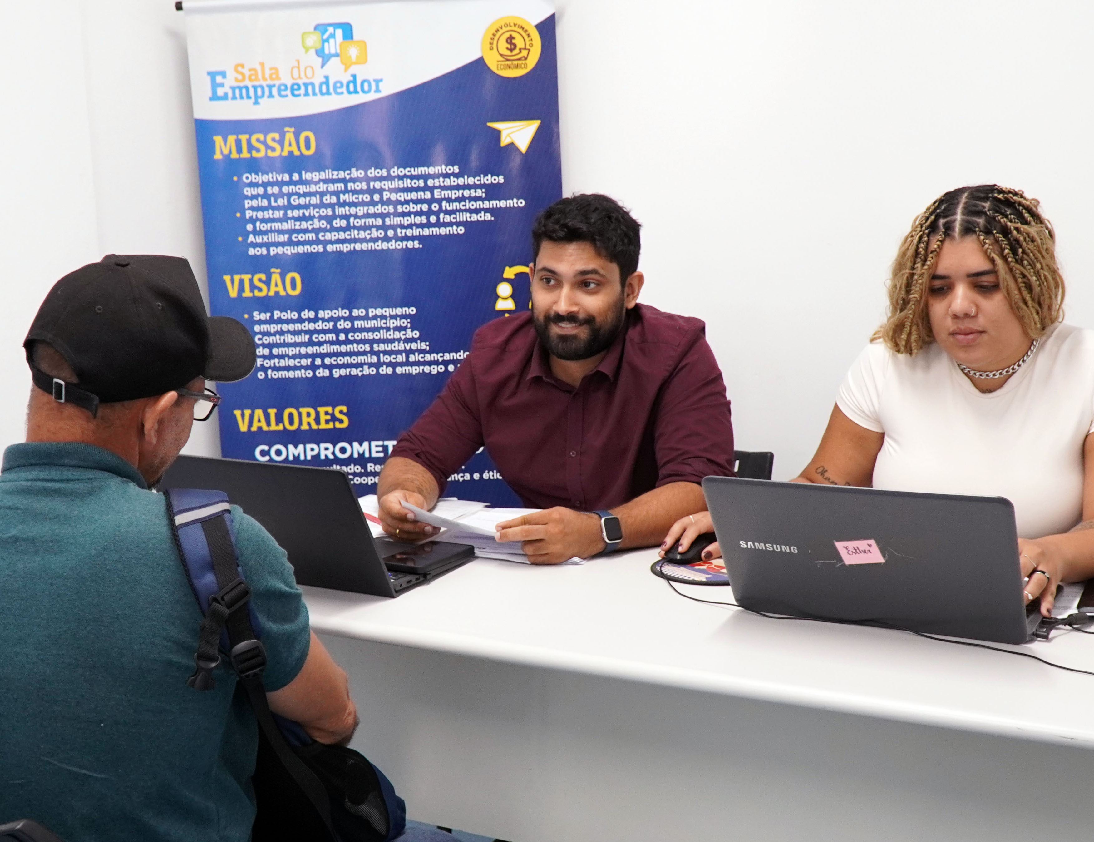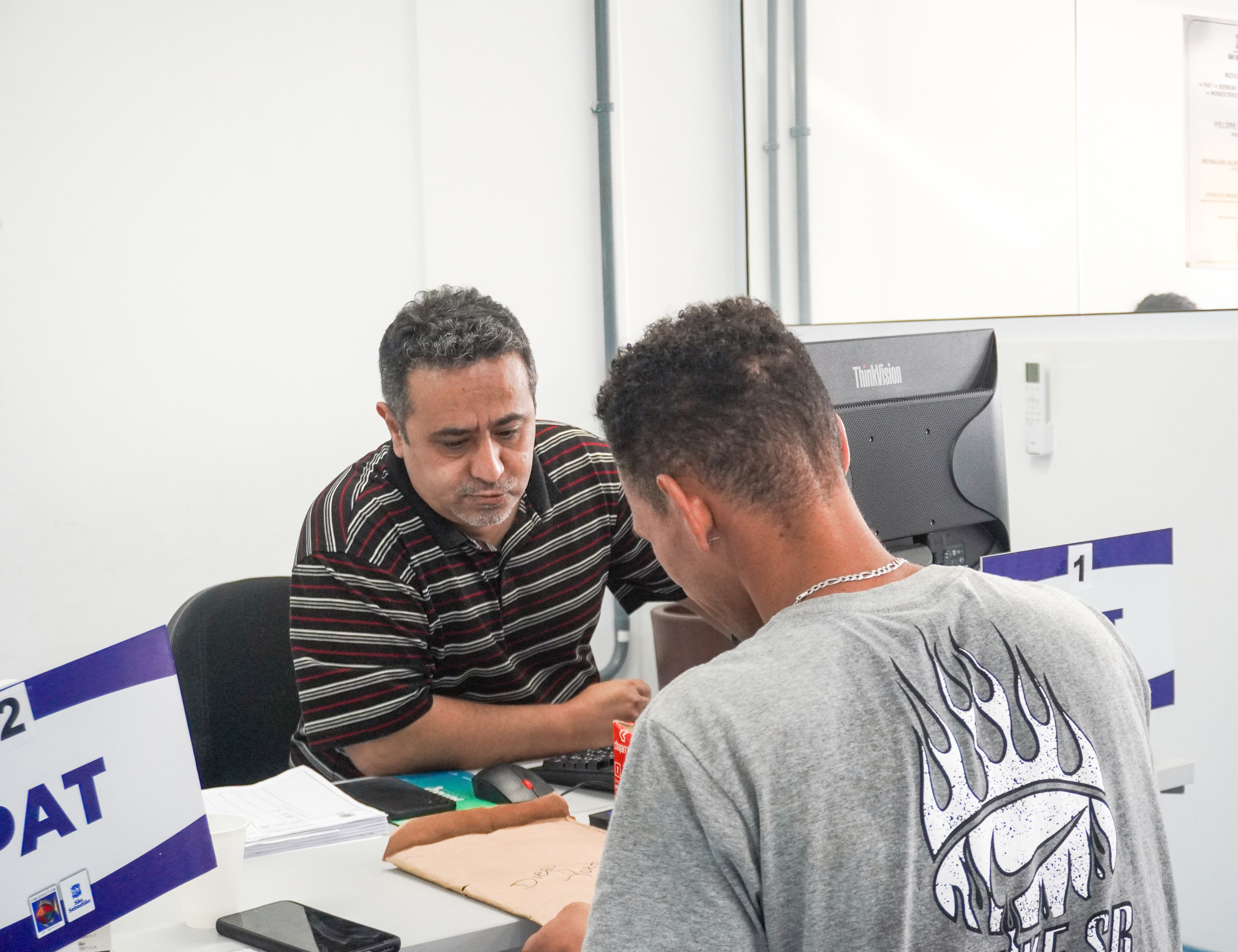 #ParaTodosVerem: As imagens mostram o atendimento no Posto de Atendimento ao Trabalhador (PAT) de São Sebastião e a fachada da Secretaria de Desenvolvimento Econômico e Social (SEDES), onde o serviço funciona. Fim da descrição.