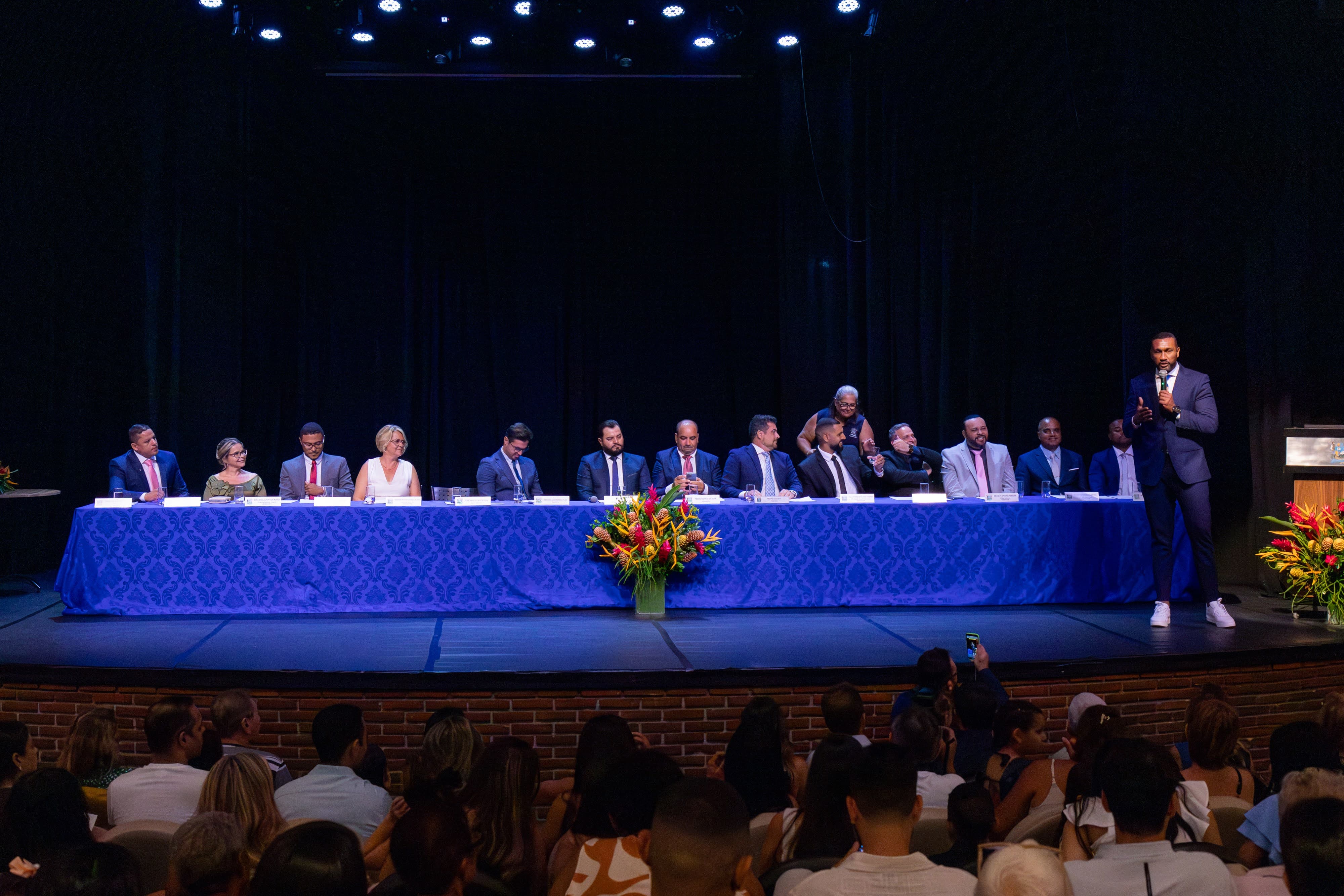 #PraTodosVerem: imagens da cerimônia de posse realizada no Teatro Municipal de São Sebastião. Fim da descrição.