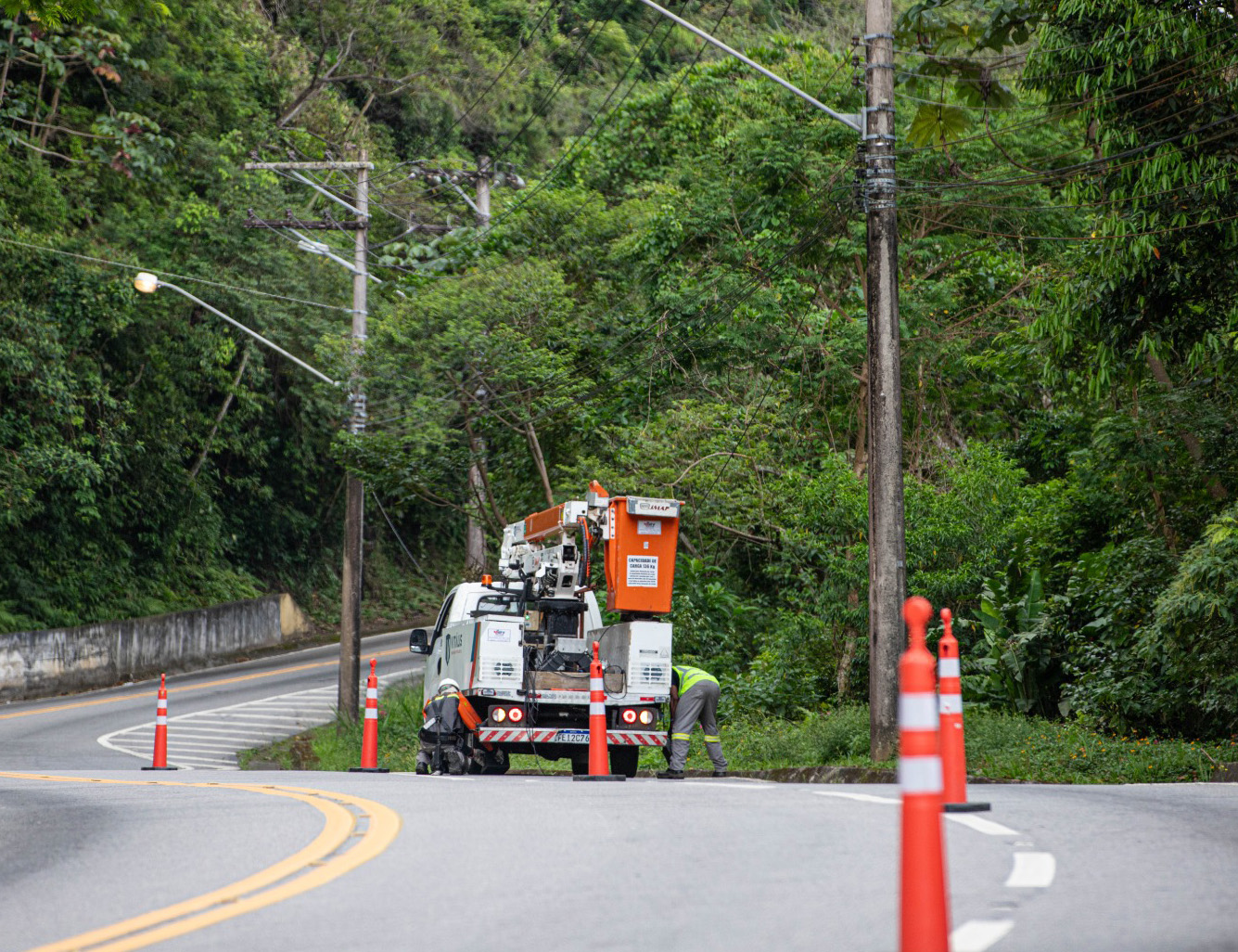 #PraTodosVerem: #PraTodosVerem: Trabalhadores da equipe de iluminação pública aparecem utilizando caminhões equipados com cesto aéreo para substituir luminárias ao longo da estrada em meio à vegetação densa. Em diferentes ângulos, é possível ver os técnicos com equipamentos de proteção individual realizando a troca das lâmpadas por modelos de LED, enquanto cones sinalizam a via para garantir segurança durante o serviço. Fim da descrição.