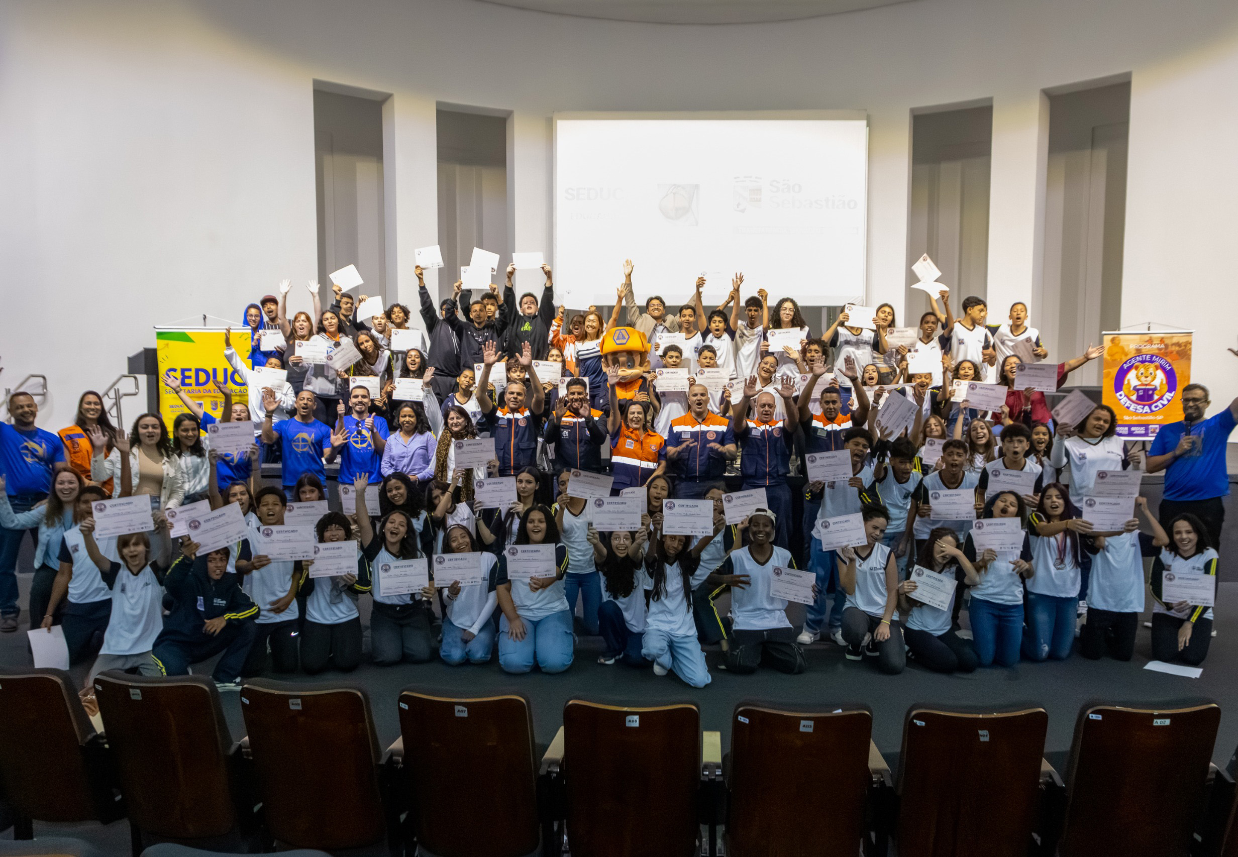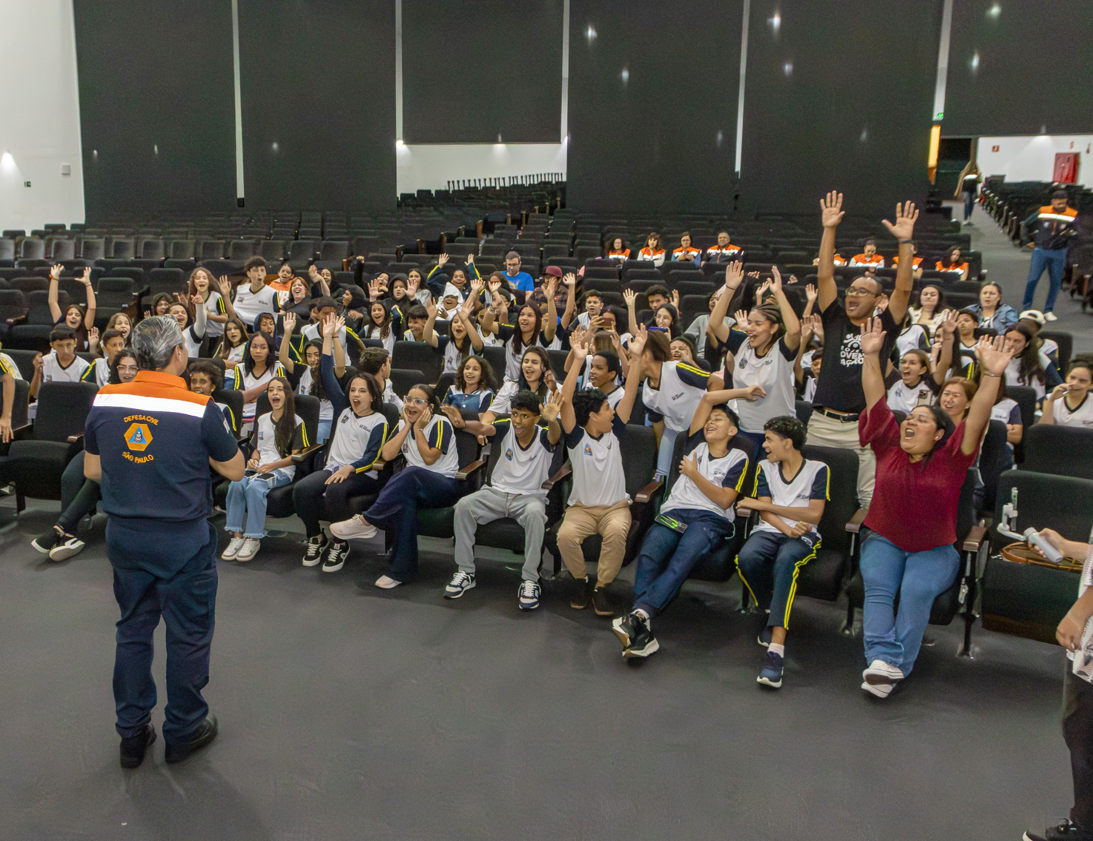 #PraTodosVerem Em uma série de fotos, estudantes uniformizados participam de atividades educativas e interativas ao lado de profissionais da Defesa Civil e da Secretaria de Educação; o grupo aparece reunido em um auditório segurando certificados e comemorando uma formatura, visitando uma sala de monitoramento com agentes explicando o funcionamento dos equipamentos, interagindo animadamente em uma dinâmica de perguntas e respostas e vibrando com as atividades conduzidas pelos instrutores, demonstrando engajamento, alegria e aprendizado ao longo de toda a ação. Fim da descrição.
