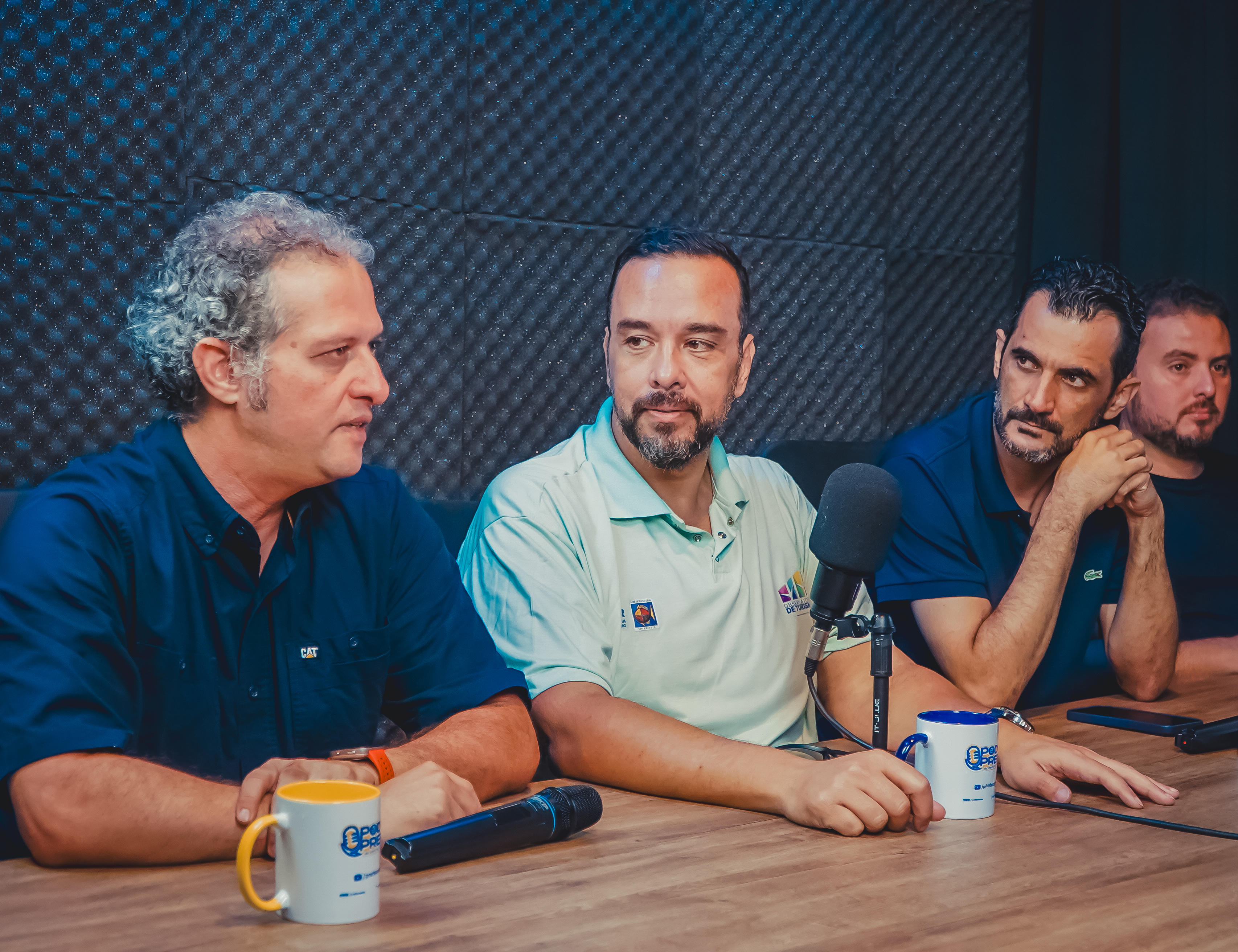#PraTodosVerem: As imagens registram o clima descontraído da gravação do Pod da Prefs, com os participantes reunidos em estúdio, sorridentes e à vontade durante a conversa. Sentados à mesa, eles compartilham o momento com canecas personalizadas do programa, enquanto o cenário exibe o logotipo no monitor ao fundo. Fim da descrição.