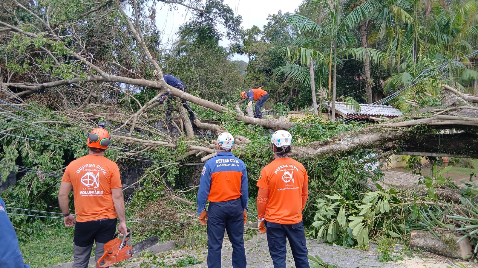 #PraTodosVerem: As imagens mostram ações de emergência realizadas pela Defesa Civil de São Sebastião após a queda de uma árvore de grande porte sobre a fiação elétrica. Na primeira foto, feita à noite, um profissional realiza corte nos galhos com a ajuda da iluminação intensa da equipe, próximo a um poste de energia. Já na segunda imagem, durante o dia, diversos agentes da Defesa Civil — com uniformes laranja e azul — trabalham no corte e remoção da árvore caída, que está entrelaçada em fios elétricos, obstruindo uma via próxima a residências rodeadas por vegetação. Fim da descrição.