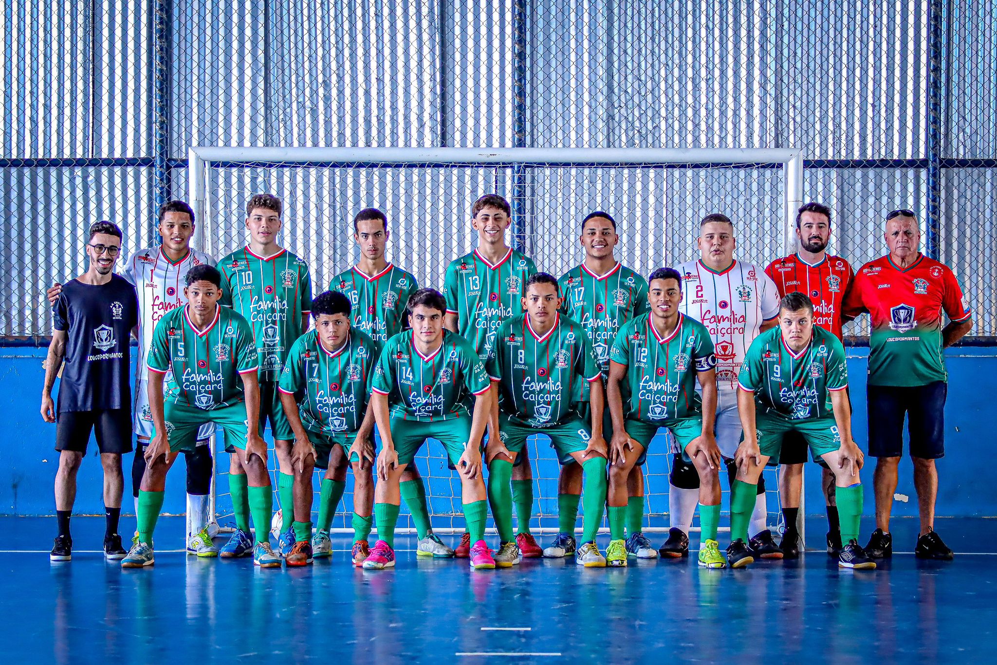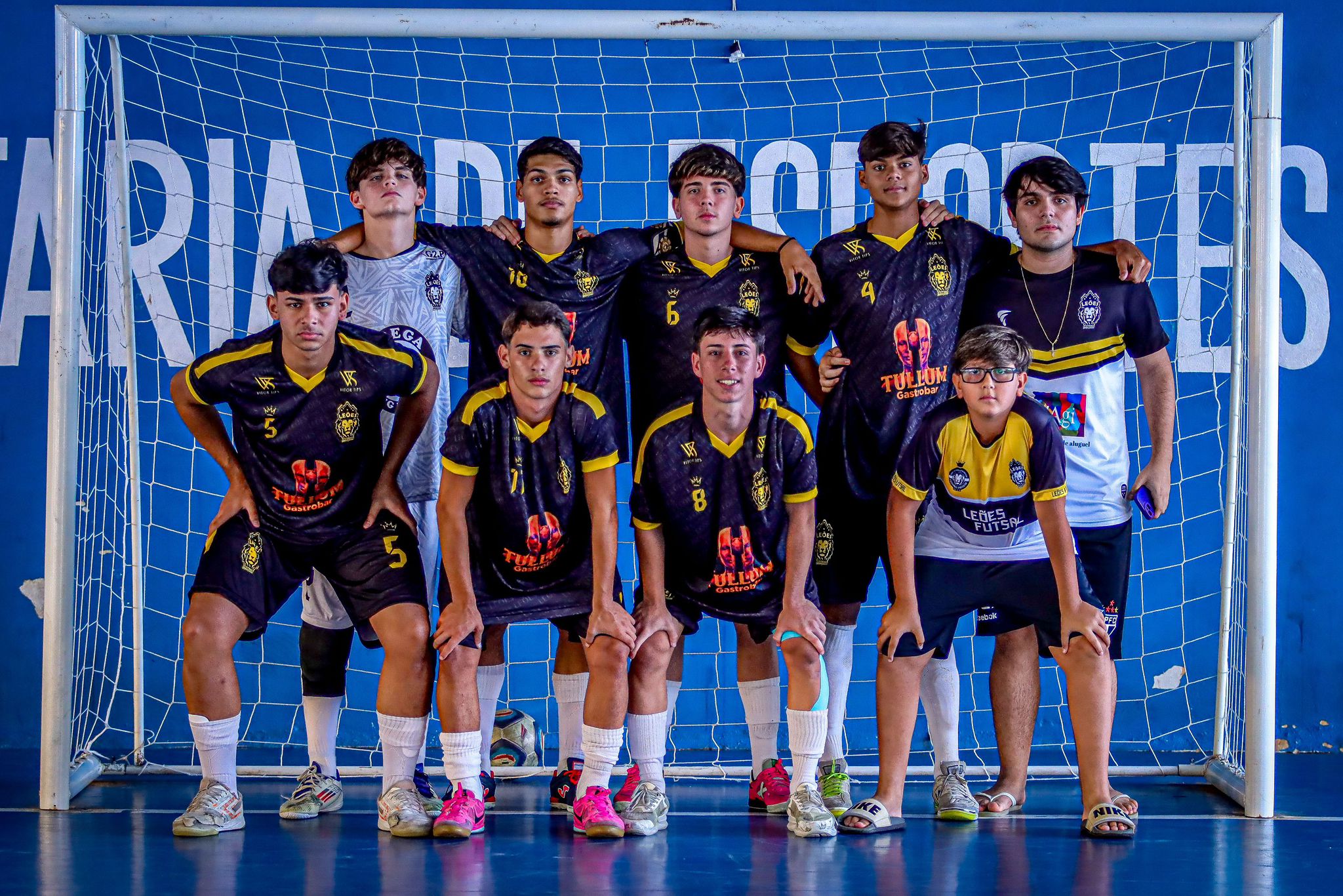 #PraTodosVerem: os semifinalistas da 15ª Copa Sebastianense de Futsal Sub-18 posam para a foto oficial antes das disputas decisivas. Uma das equipes veste uniforme preto com detalhes amarelos, outra utiliza uniforme vermelho, enquanto duas equipes entram em quadra com uniforme verde e branco. Ambas demonstram união e espírito de equipe, representando com garra suas camisas em busca de uma vaga na grande final da competição. Fim da descrição.