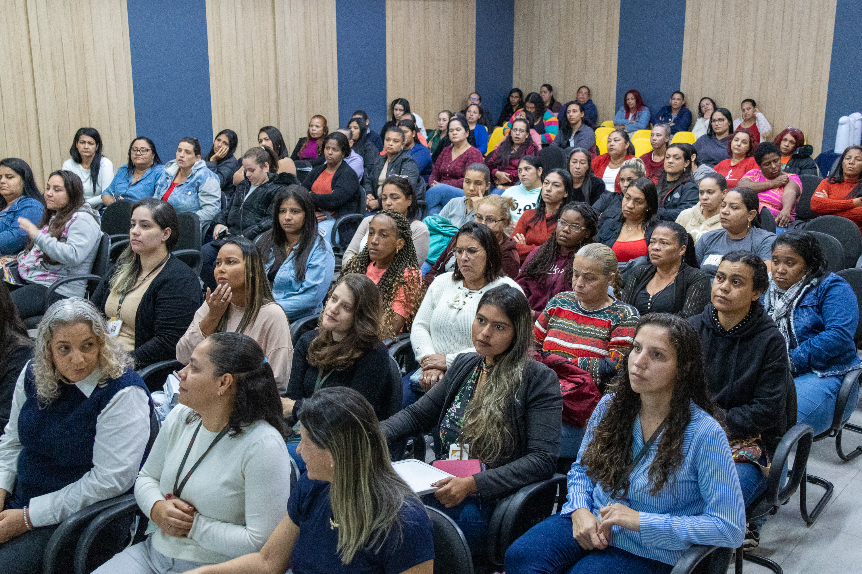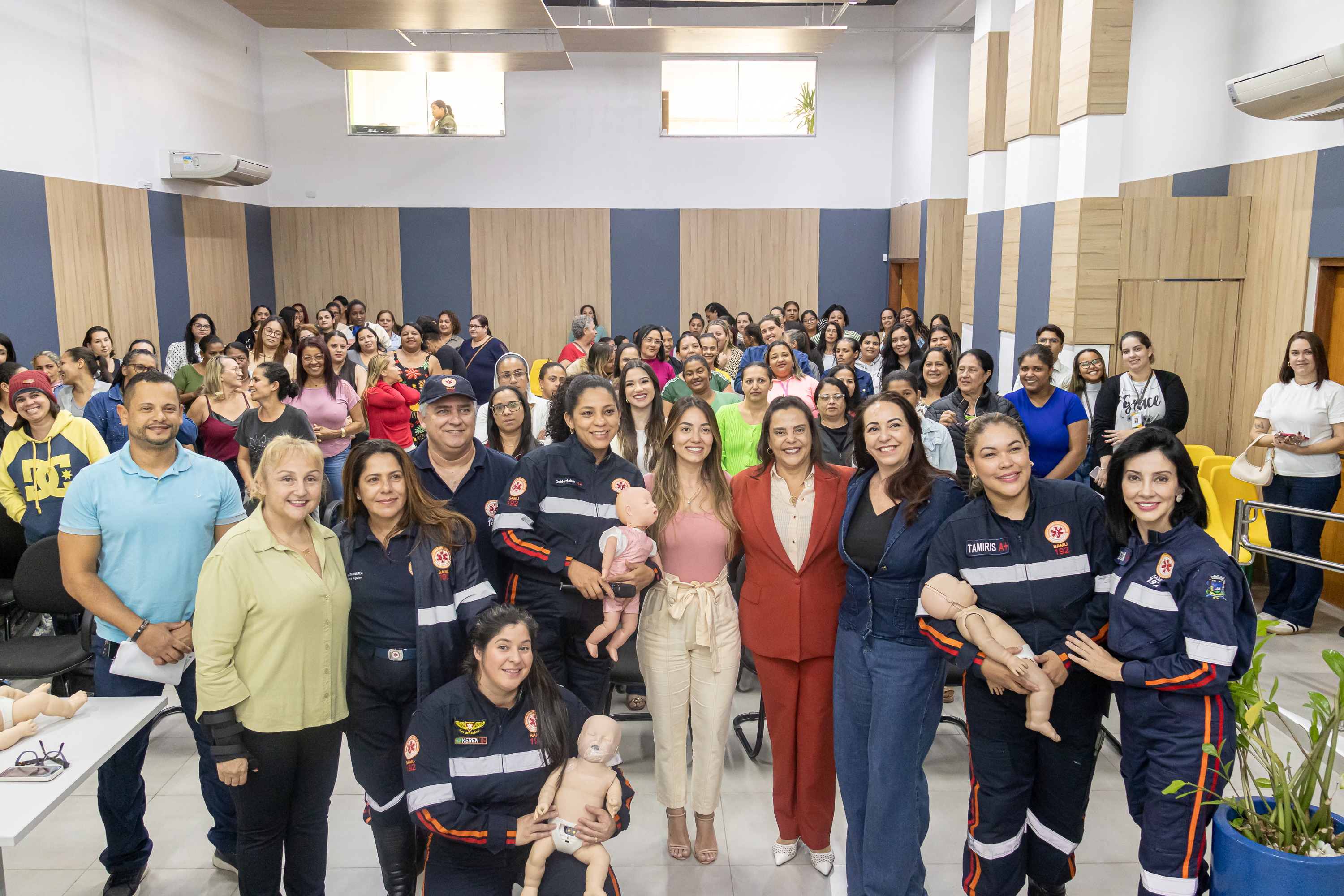 #PraTodosVerem: no auditório da Seduc, merendeiras da rede municipal de São Sebastião assistem atentamente a palestras e simulações práticas. As imagens mostram momentos de aprendizado coletivo, incluindo demonstrações de primeiros socorros com bonecos e dinâmicas interativas sobre higiene e segurança alimentar. Também aparecem profissionais do SAMU e da empresa responsável pela merenda escolar, junto à secretária da Educação e outras autoridades, reunidos para registrar o encerramento da formação com um grupo de dezenas de participantes. Fim da descrição.