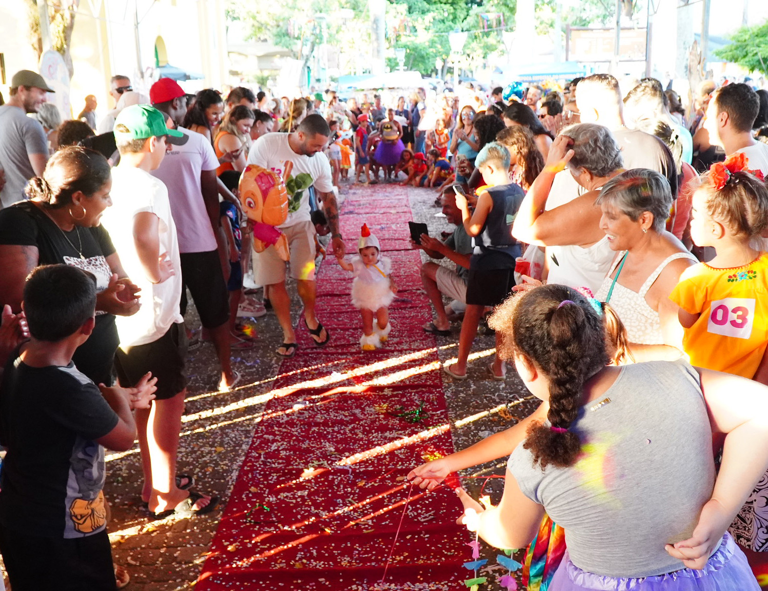 #PraTodosVerem: Imagens do Concurso de Fantasia Infantil no Carnaval de São Sebastião. Crianças desfilam fantasiadas em uma passarela vermelha, cercadas por familiares e público aplaudindo. Há fantasias coloridas, confetes pelo chão e um grande grupo reunido em clima de alegria. Em outra cena, uma criança posa ao lado de um personagem caracterizado, com mesa de prêmios ao fundo e representantes do evento no palco. Fim da descrição.