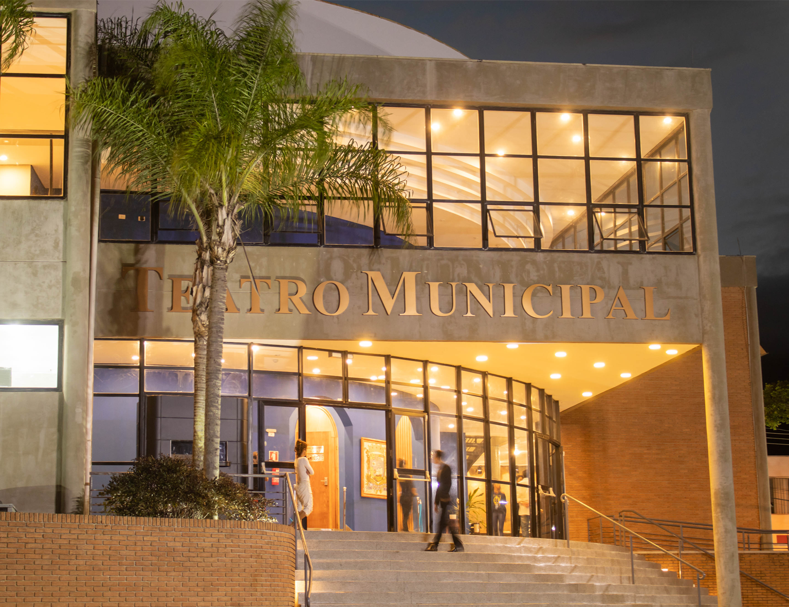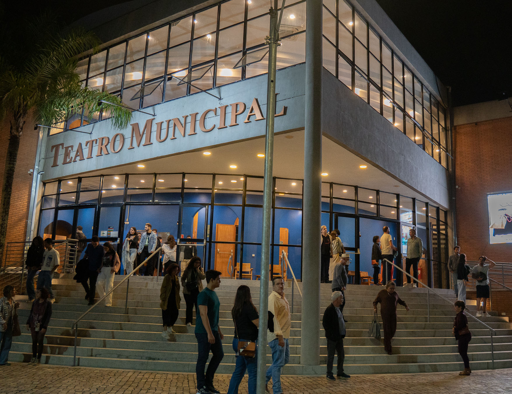 #PraTodosVerem: imagem da fachada do Teatro Municipal de São Sebastião com pessoas em frente. Fim da descrição.