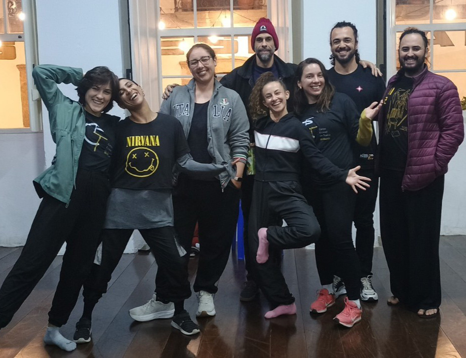 #PraTodosVerem: Oito pessoas do Corpo Estável de Teatro de São Sebastião estão posando sorridentes em um ambiente interno com piso de madeira e paredes brancas, durante um ensaio. Fim da descrição.