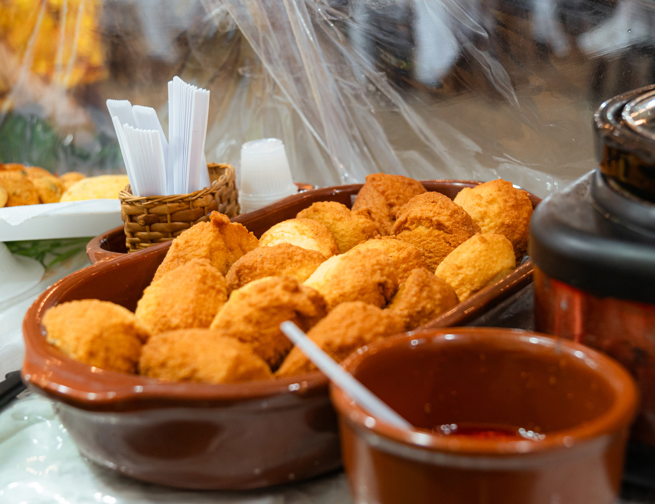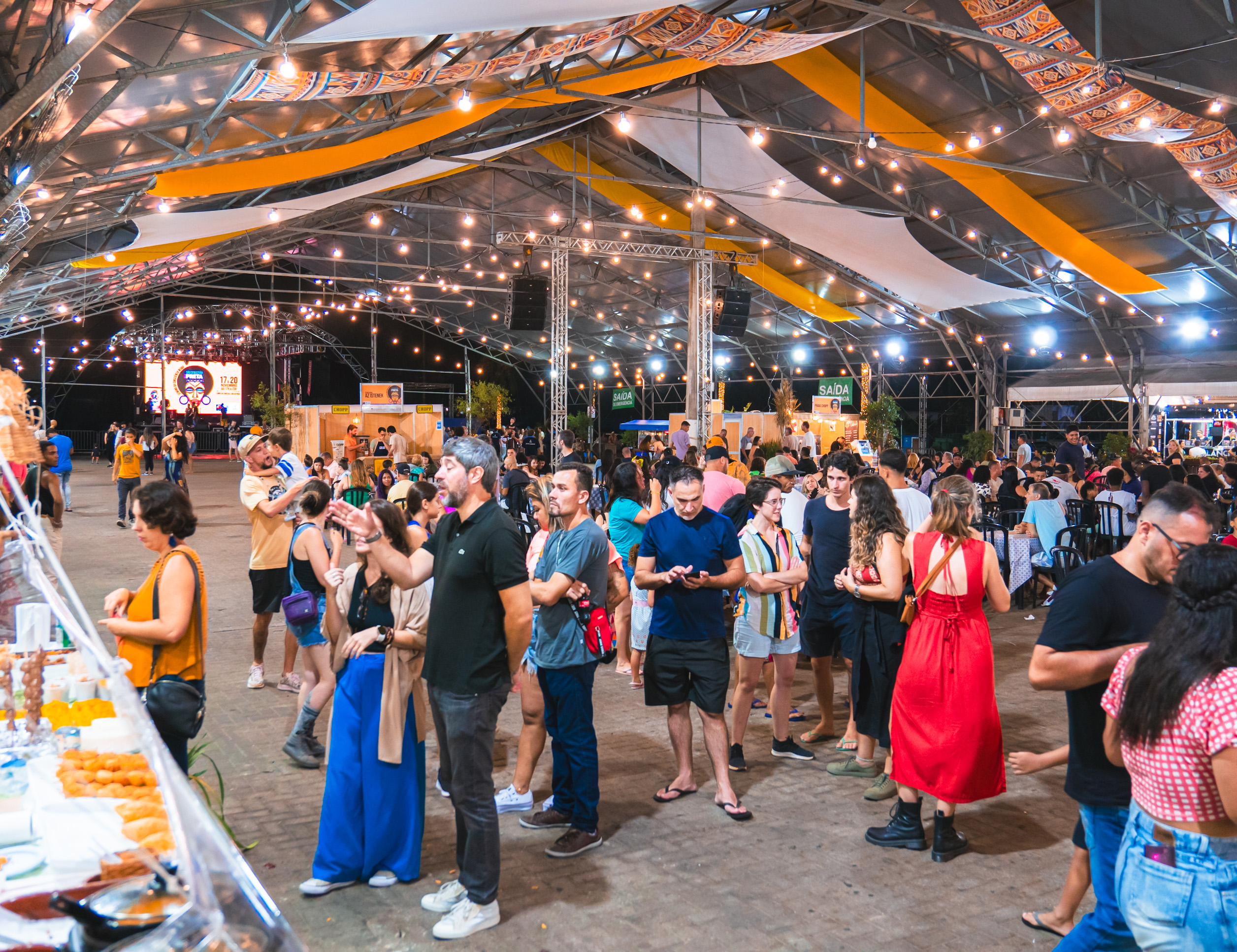#PraTodosVerem: Na primeira foto, mesas decoradas exibem pratos com camarões e petiscos. Na segunda, acarajés dourados estão dispostos em uma travessa. Na terceira, o público circula e conversa sob uma tenda iluminada com luzes decorativas. Fim da descrição.