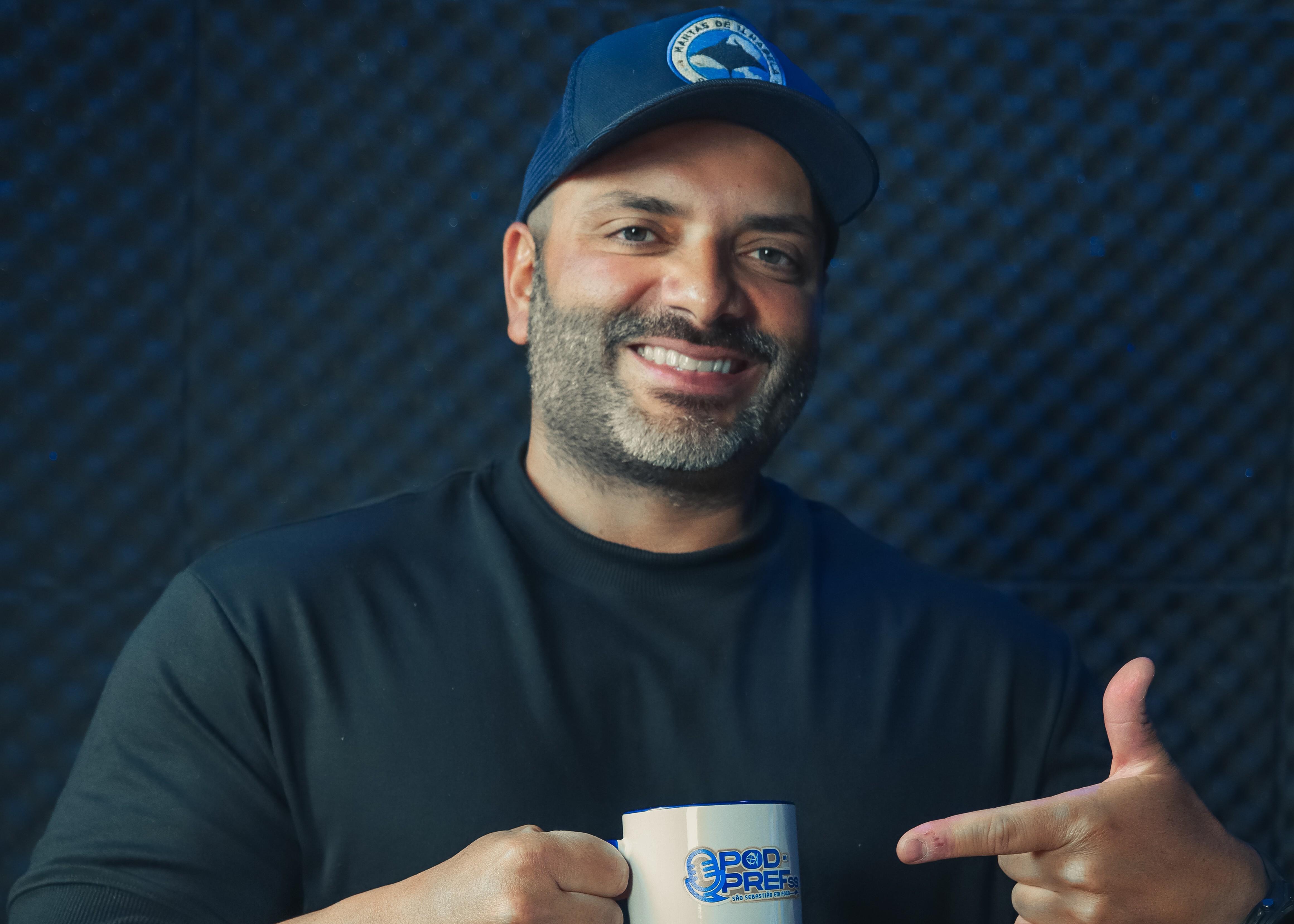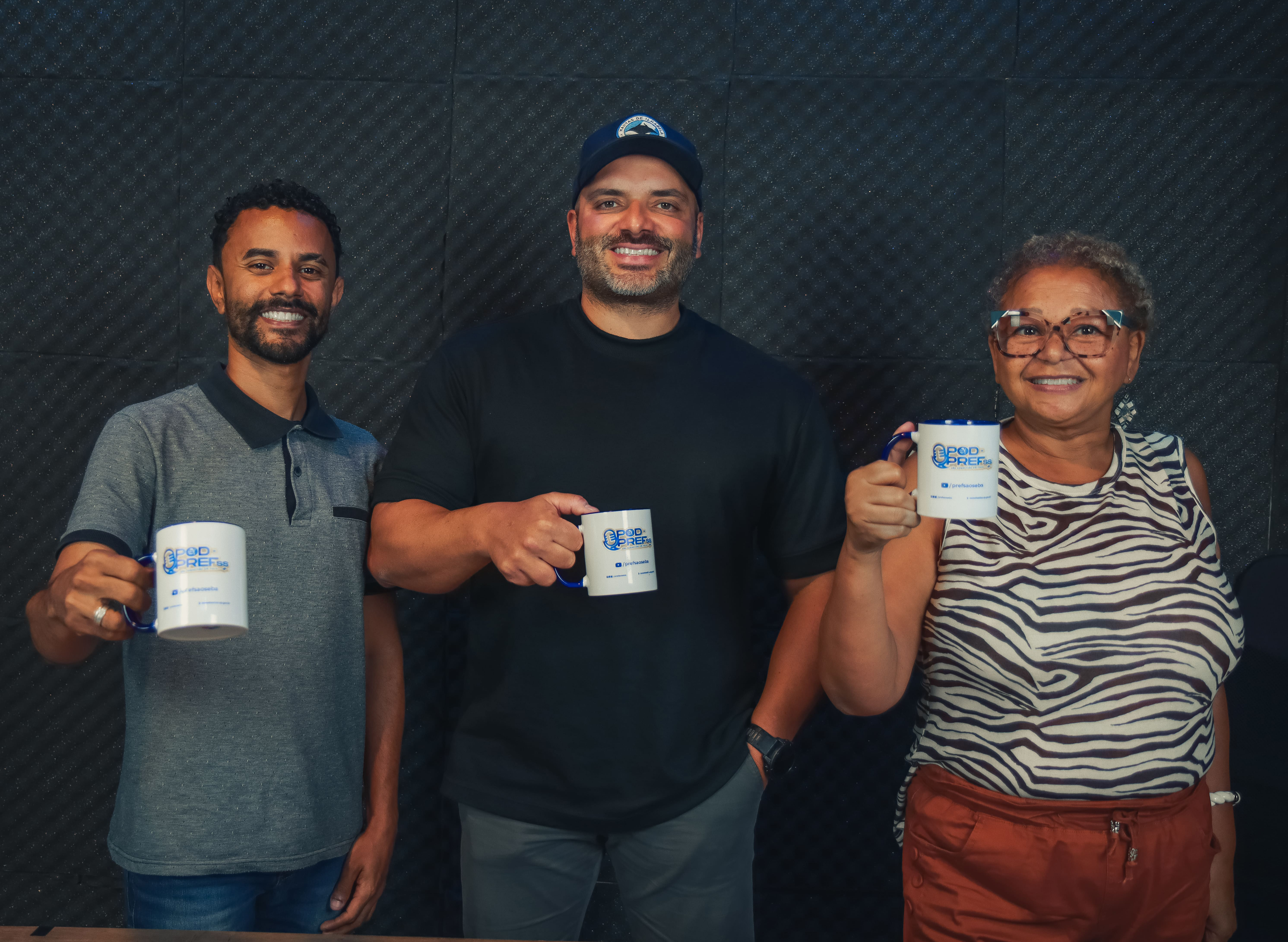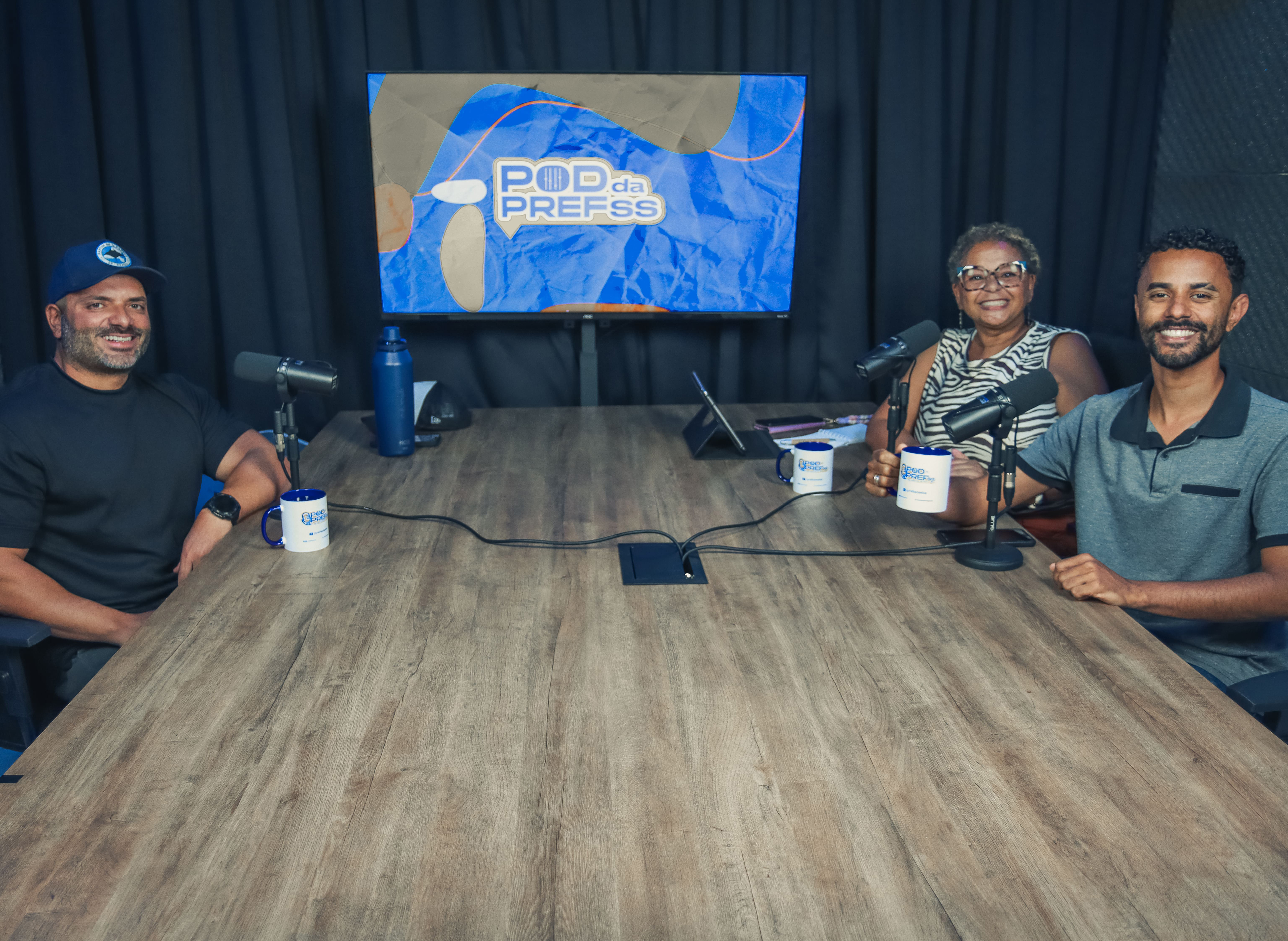 #PraTodosVerem: As imagens registram o clima descontraído da gravação do Pod da Prefs, com os participantes reunidos em estúdio, sorridentes e à vontade durante a conversa. Sentados à mesa, eles compartilham o momento com canecas personalizadas do programa, enquanto o cenário exibe o logotipo no monitor ao fundo. Fim da descrição.