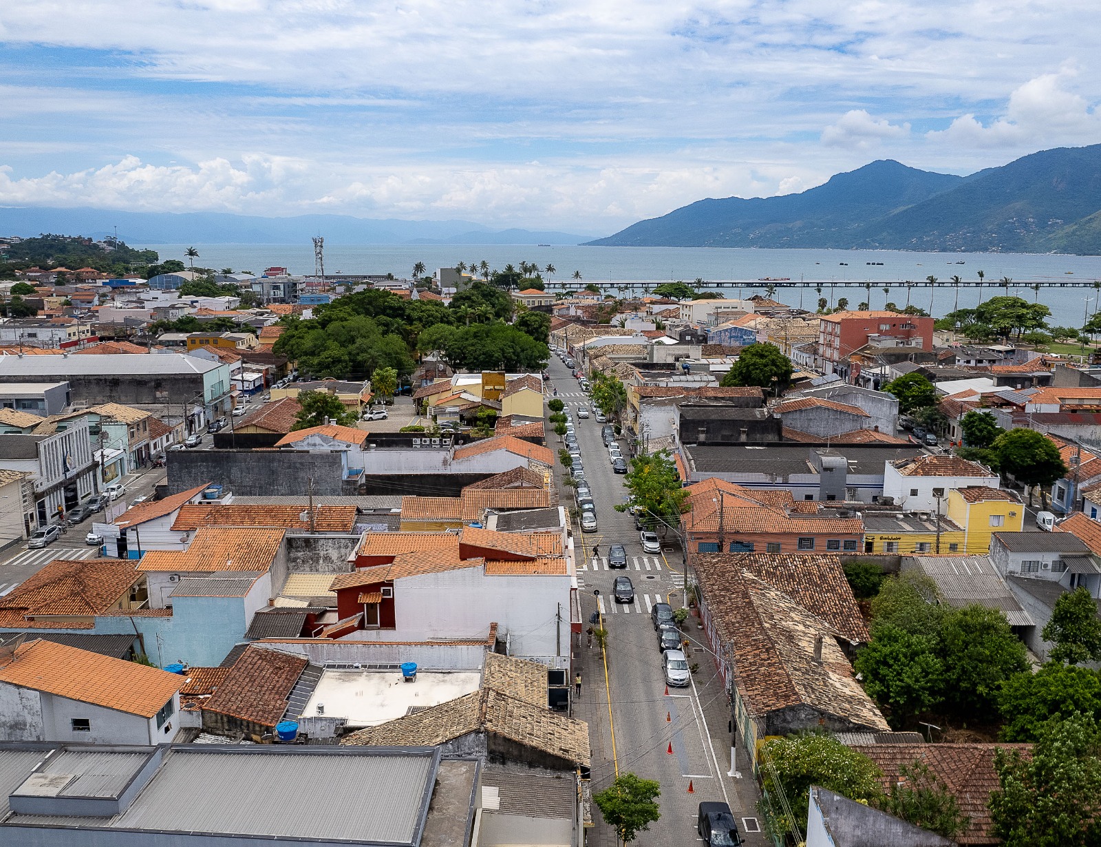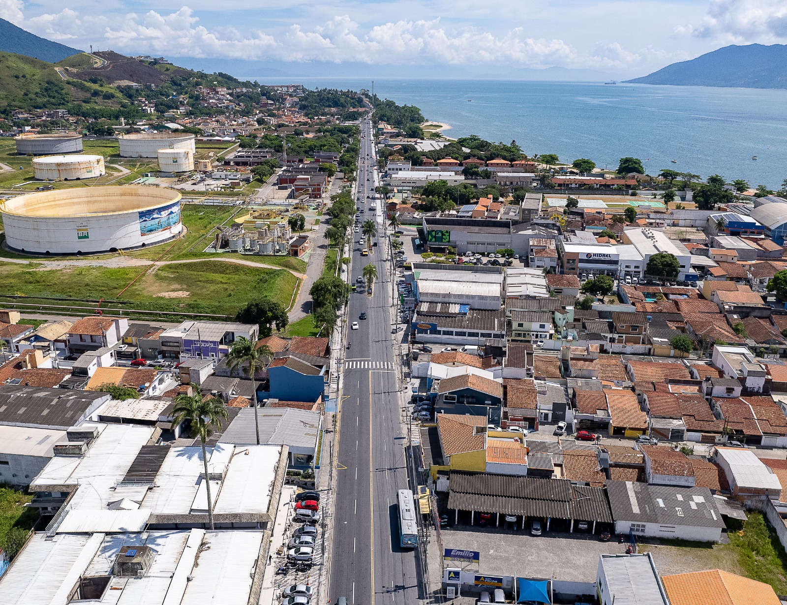 #PraTodosVerem: imagens aéreas mostram diferentes regiões urbanas e áreas de lazer de São Sebastião. É possível observar estruturas industriais, vias comerciais com grande movimentação, prédios residenciais e comerciais, além de uma extensa área de lazer à beira-mar, com quadras esportivas, brinquedos de parque e ciclovia. Ao fundo, o mar e as montanhas completam a paisagem, destacando a integração entre natureza e desenvolvimento urbano. Fim da descrição.