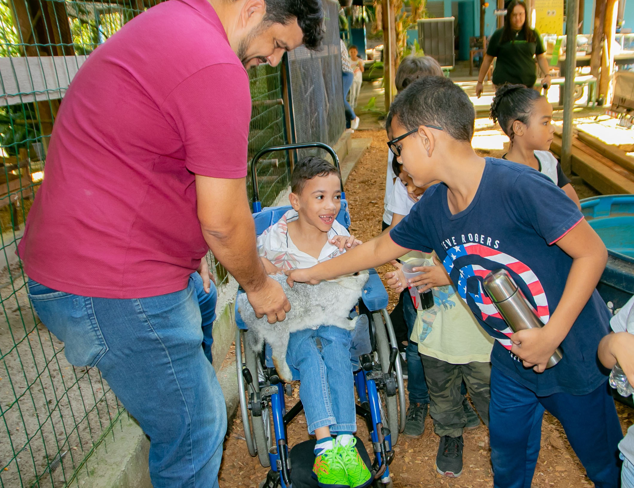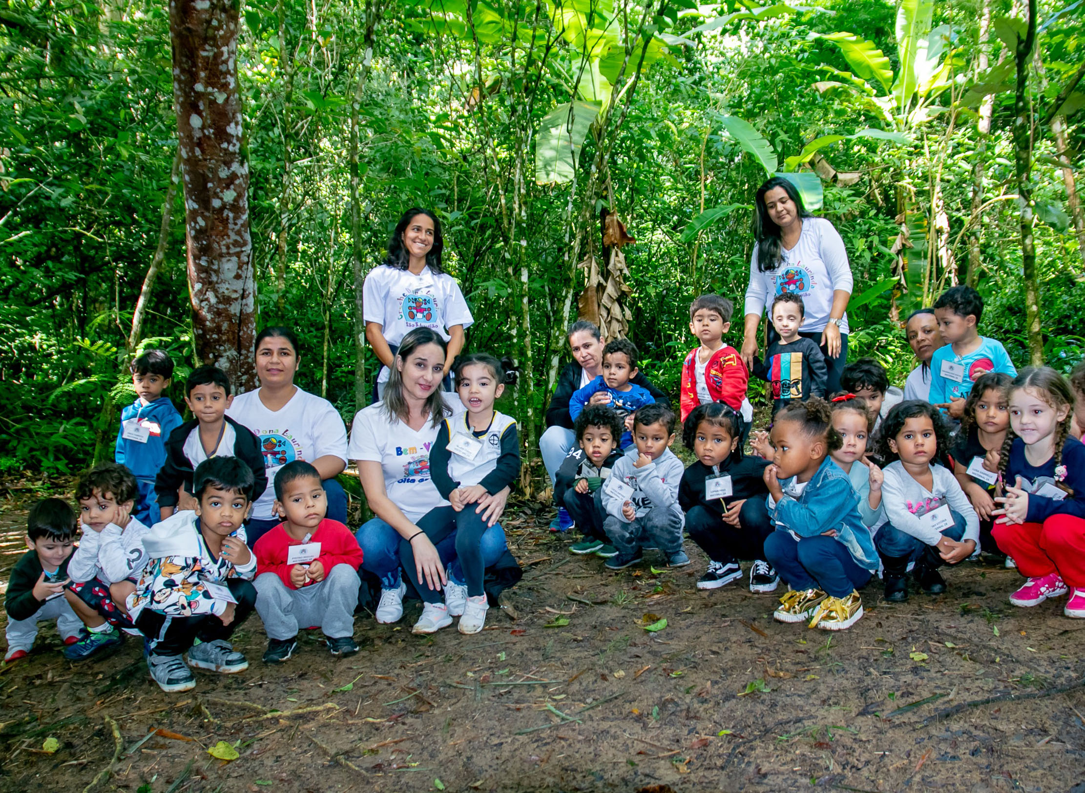 #PraTodosVerem: Imagens mostram crianças, jovens e adultos em atividades educativas ao ar livre, com contato com a natureza. Há interação com um pequeno animal, caminhada em trilha, plantio em horta e um momento de grupo com crianças e adultos posando para foto. Ambiente verde, pessoas em roupas casuais, clima de aprendizado, inclusão e convivência. Fim da descrição.