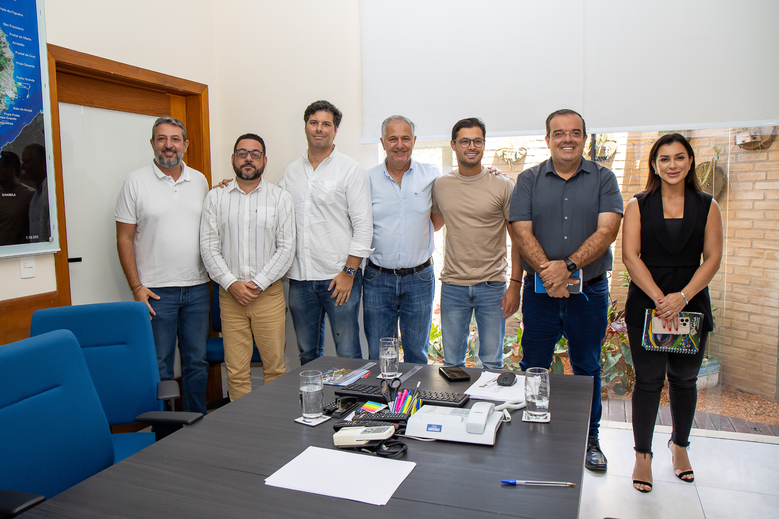 #PraTodosVerem: Prefeito Reinaldinho em seu gabinete com o prefeito Marcelo, de Bertioga, secretários e representantes da Pássaro Marrom. Fim da descrição.