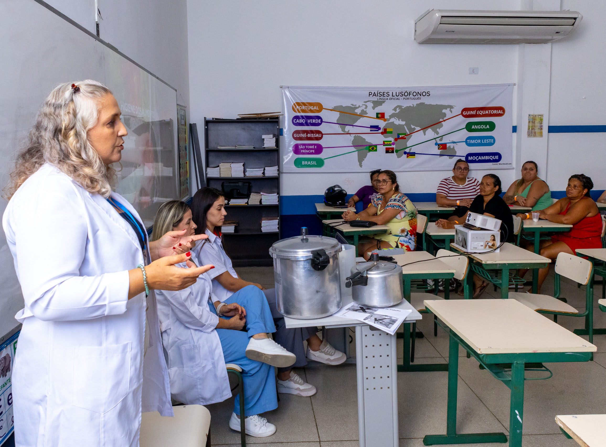 O encontro ocorreu na Escola Municipal Prof.ª Patrícia Viviani Santana, no bairro Topolândia, e proporcionou às profissionais aprofundamento sobre procedimentos relacionados à alimentação escolar, com foco na qualidade dos alimentos, na segurança alimentar e na saúde do trabalhador.
