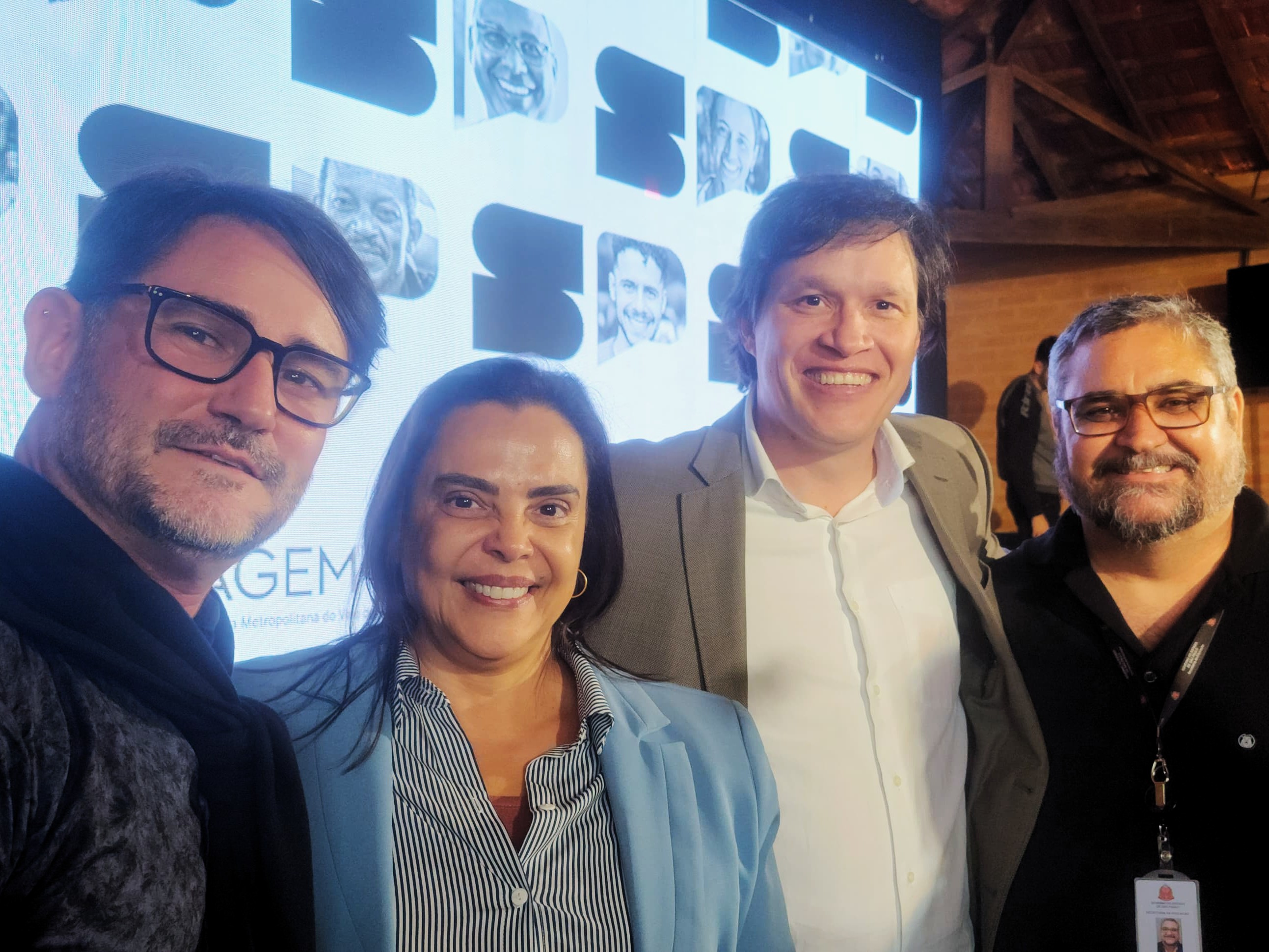 #PraTodosVerem: quatro imagens da 35ª Reunião do Conselho de Desenvolvimento da Região Metropolitana do Vale do Paraíba e Litoral Norte, realizada em Cunha. A primeira foto mostra uma mesa em formato de “U” com participantes sentados e uma faixa azul ao centro com o nome do evento. A segunda imagem apresenta a visão ampla do salão com representantes de diversos municípios. Na terceira foto, o secretário executivo de Estado da Educação, Vinícius Neiva, faz uma apresentação segurando um microfone, ao fundo um telão com informações sobre alfabetização. A quarta imagem mostra um grupo sorrindo para a câmera, ao centro está a secretária de Educação de São Sebastião, Marta Braz, e o secretário Vinícius Neiva, junto de outros dois participantes.