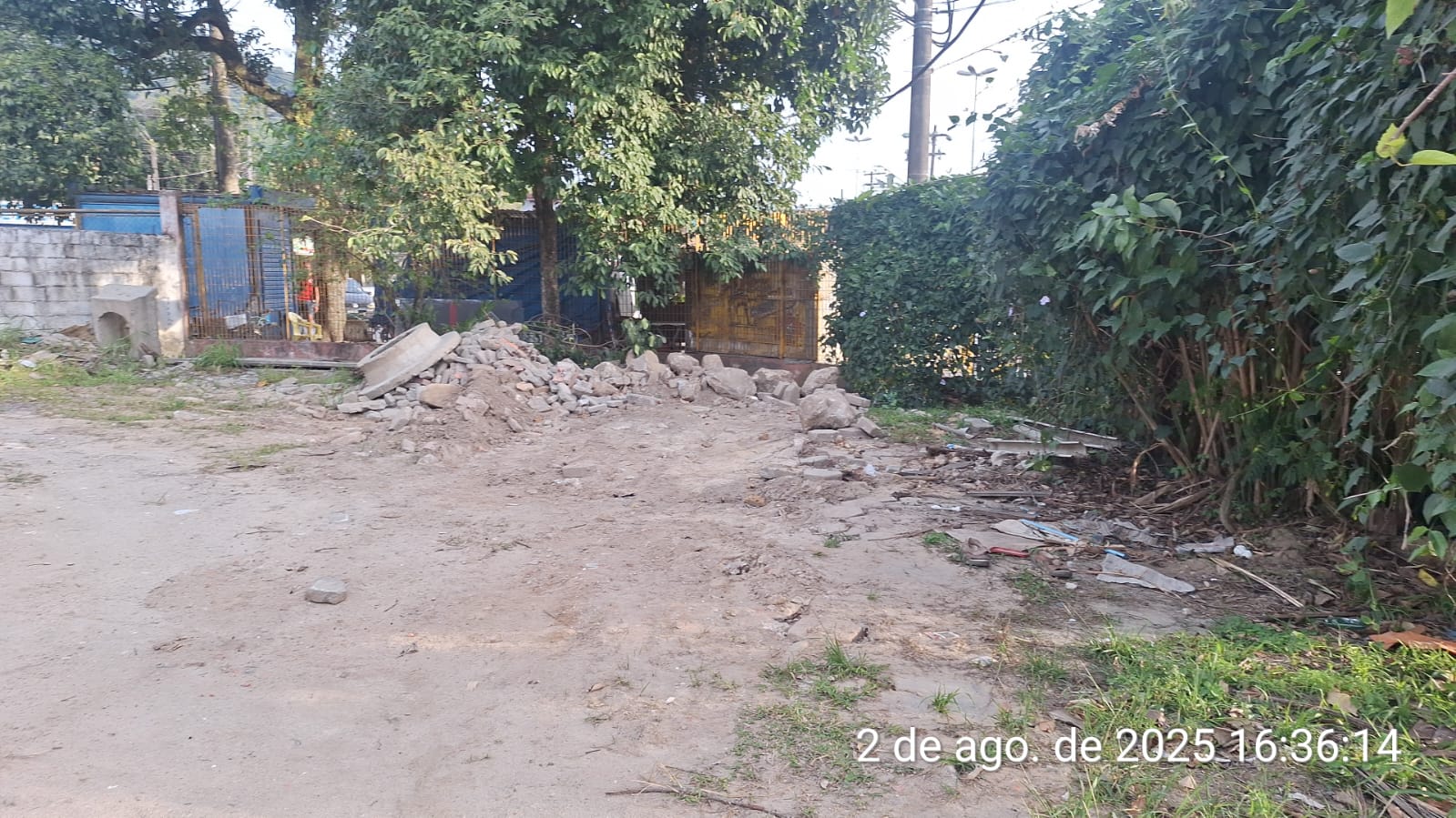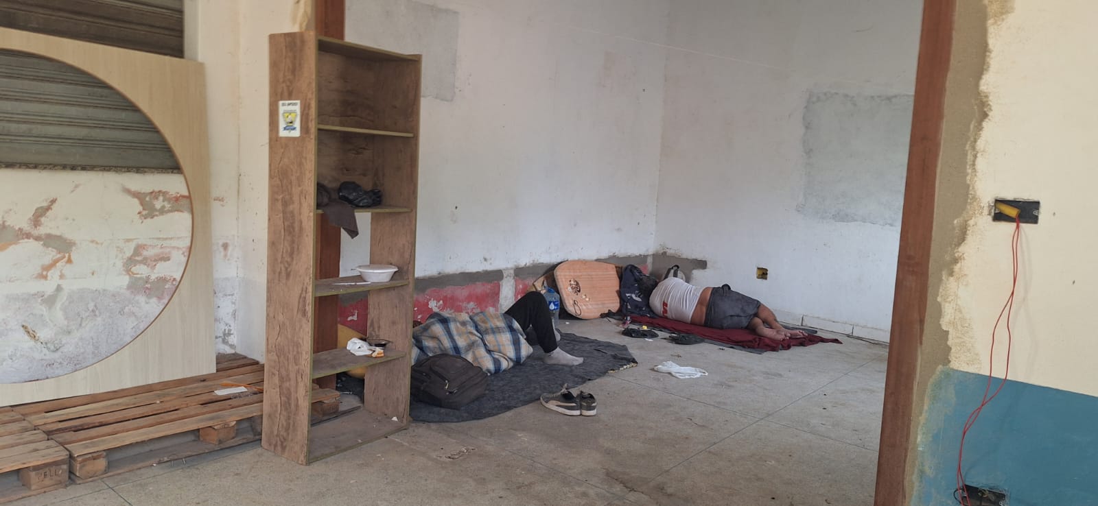 #PraTodosVerem: a primeira imagem mostra o interior de um cômodo com paredes desgastadas, chão de cimento e pouca mobília. Duas pessoas estão deitadas no chão, uma coberta por um cobertor xadrez e outra usando camiseta branca e bermuda preta. Há pertences pessoais espalhados ao redor e uma estante de madeira com poucos objetos. A segunda imagem mostra uma área externa com entulho de construção e restos de materiais espalhados pelo chão de terra. Ao fundo, há árvores, arbustos e estruturas metálicas, com parte de um muro de blocos à esquerda.
