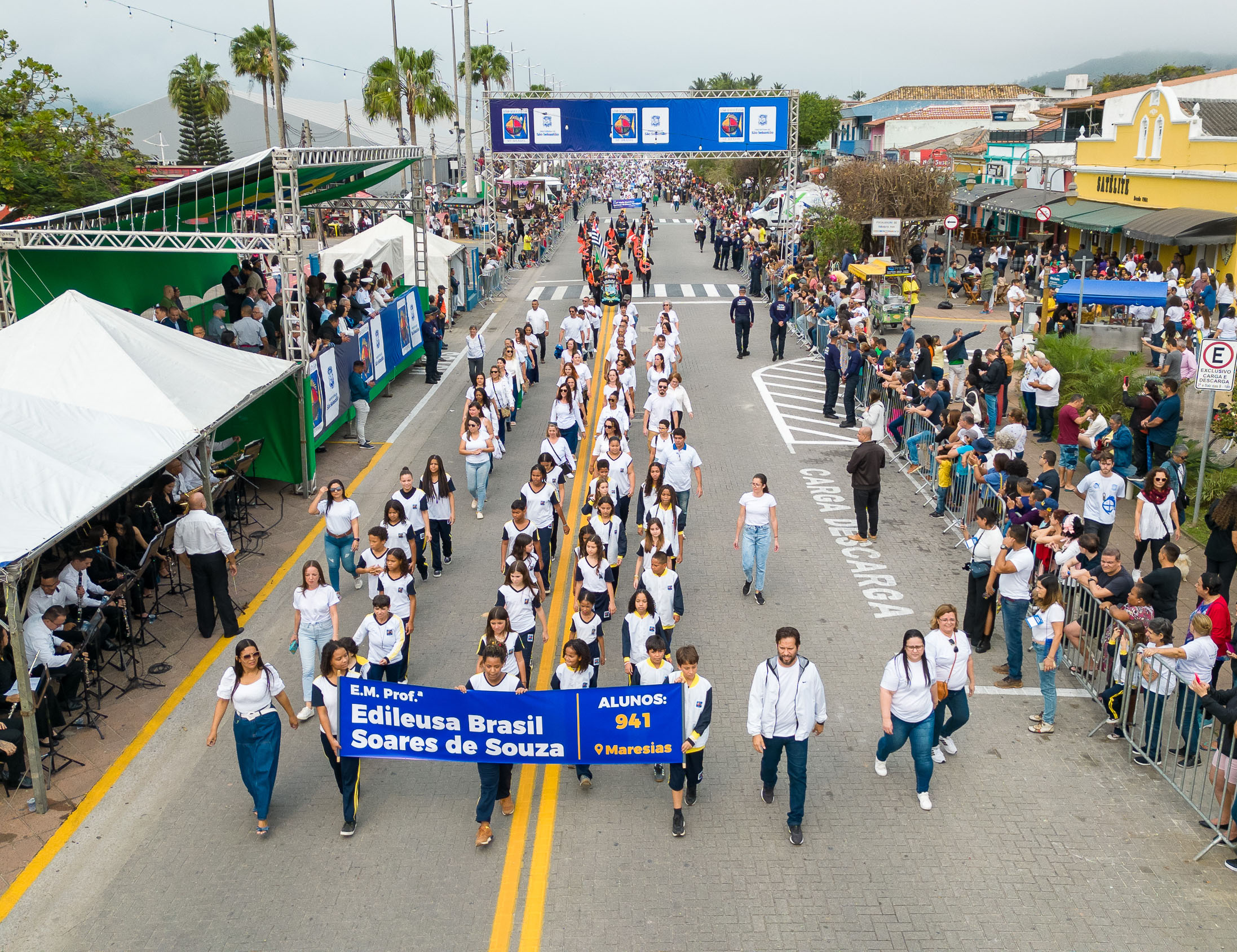 #PraTodosVerem: Quatro imagens mostram momentos do Desfile de 7 de Setembro em São Sebastião. Na primeira, vista aérea, uma fanfarra com integrantes uniformizados em vermelho, preto e laranja desfila tocando instrumentos enquanto o público assiste dos dois lados da rua. Na segunda, diversos servidores da limpeza urbana, vestidos com uniformes laranja fluorescente e faixas refletivas, caminham sorridentes e acenam para o público. Na terceira, integrantes de uma banda marcial e corpo de bandeiras marcham organizados, com jovens em uniformes azul marinho e saias brancas segurando bandeiras coloridas em verde, rosa e azul, em meio a uma plateia atenta. Na quarta, um grupo numeroso de estudantes uniformizados com camiseta branca e calça jeans desfila em fila, carregando uma faixa azul com o nome da escola “E.M. Profª Edileusa Brasil Soares de Souza”, informando o número de 941 alunos da unidade de Maresias.