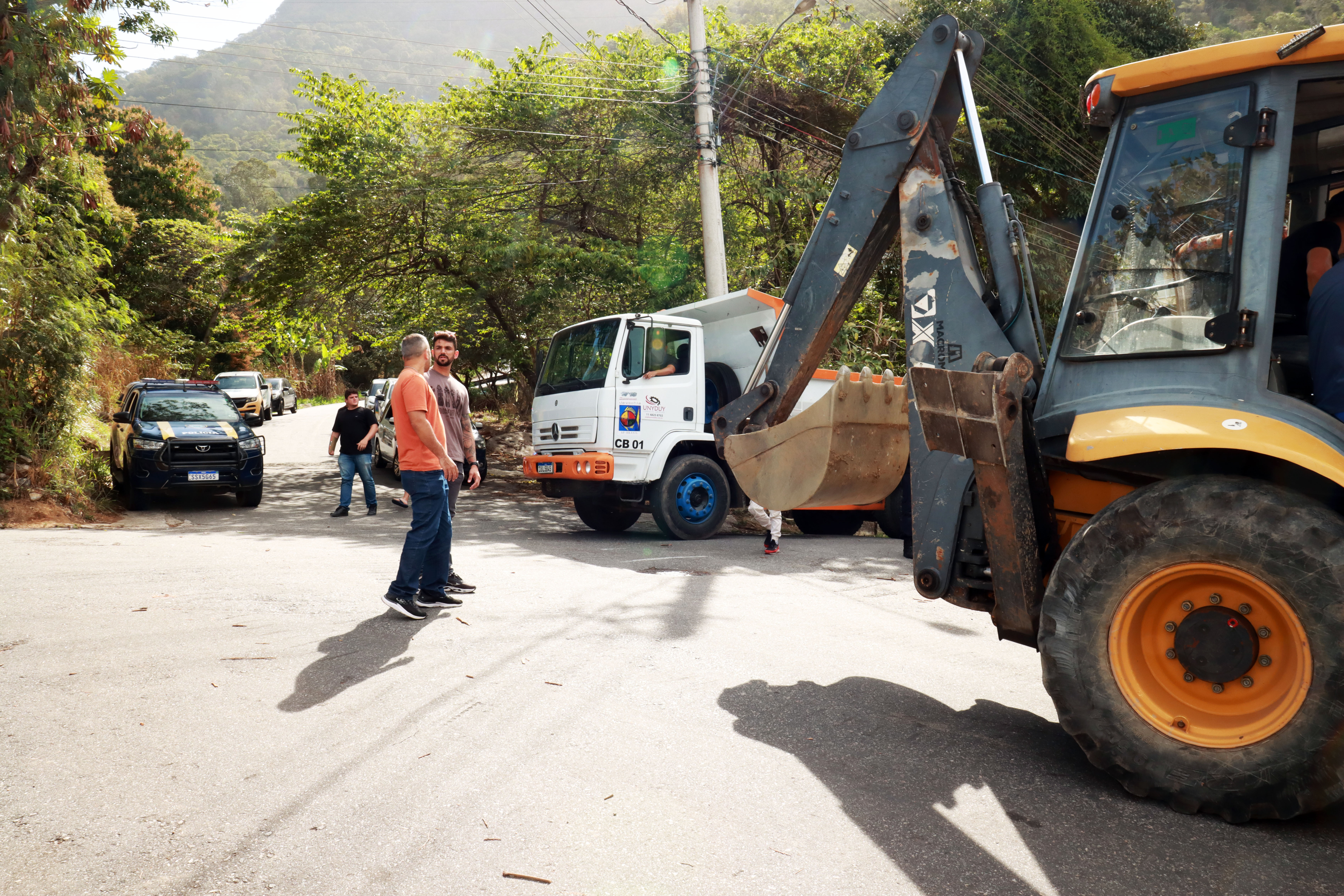 #PraTodosVerem: Equipes da Prefeitura de São Sebastião participaram de uma operação contra uma possível tentativa de grilagem, com o apoio da Polícia Civil e da Polícia Municipal, além da atuação das equipes de fiscalização da Secretaria de Meio Ambiente e Urbanismo. As imagens mostram agentes de segurança acompanhando a ação, veículos oficiais de fiscalização ambiental, maquinário e caminhões utilizados no trabalho, reforçando a integração entre os órgãos para coibir ocupações irregulares e garantir a proteção do território. Fim da descrição.