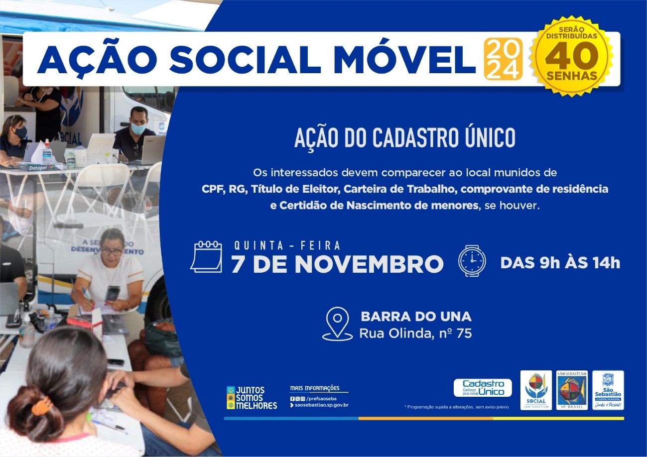 A Prefeitura de São Sebastião, por meio da Secretaria de Desenvolvimento Econômico e Social (SEDES), realiza a Ação Social Móvel, quinta-feira (7), das 9h às 14h, na Rua Olinda, 75, bairro Barra do Una, na Costa Sul, em frente à Unidade de Saúde da Família (USF).