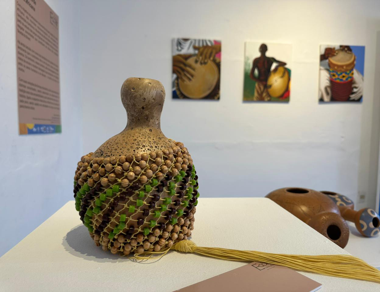 #PraTodosVerem: Quatro fotos mostram uma exposição com temática afro-brasileira. A primeira imagem exibe esculturas de mulheres negras com tecidos coloridos, expostas em uma sala de paredes amarelas com quadros ao fundo. A segunda mostra um salão com piso de madeira e obras dispostas em pedestais brancos, com um tambor e instrumentos em círculo no centro. A terceira destaca dois quadros emoldurados em parede amarela, retratando uma mulher e um homem em trajes tradicionais. A quarta foca um instrumento artesanal feito com cabaça e miçangas, com outras obras ao fundo. Fim da descrição.