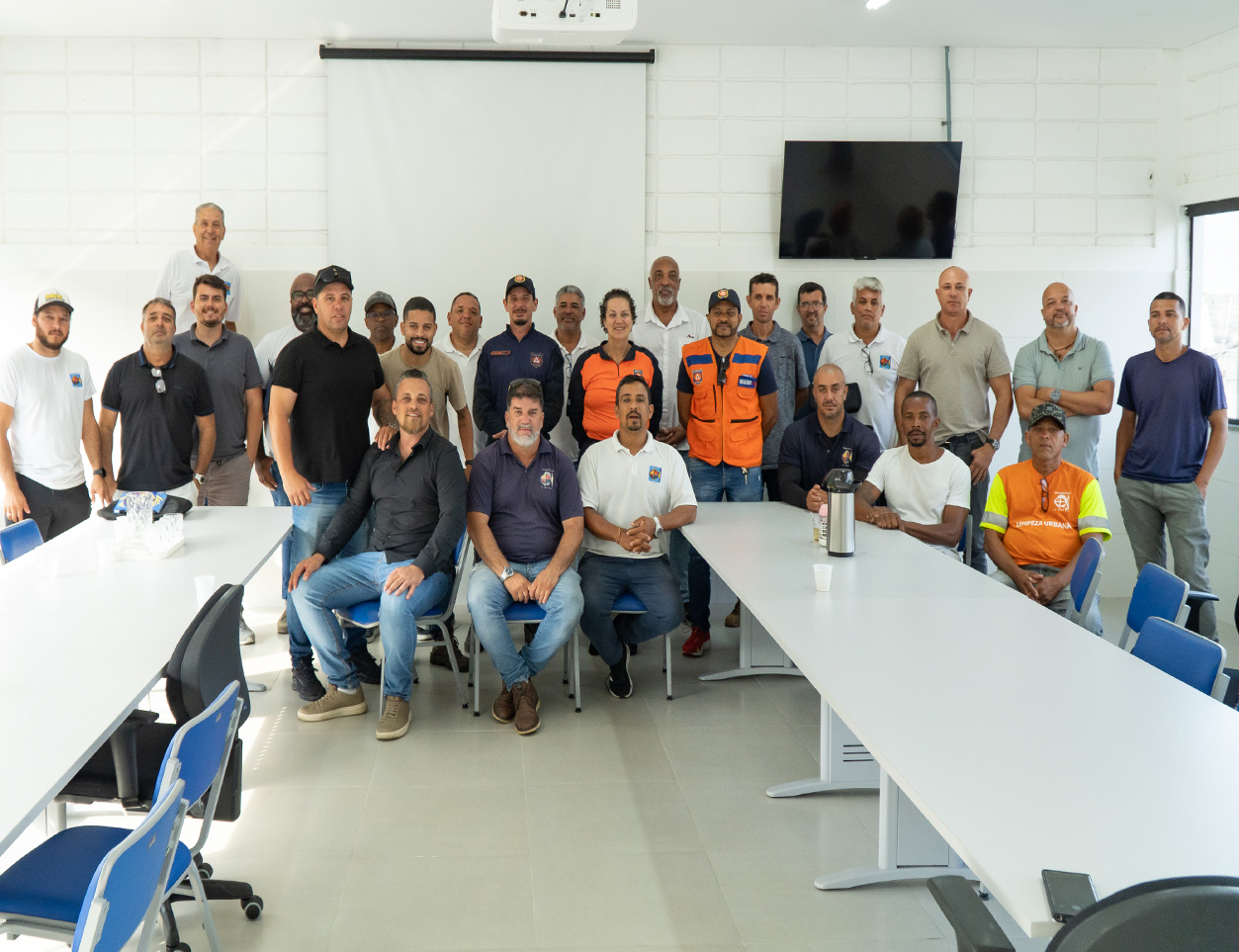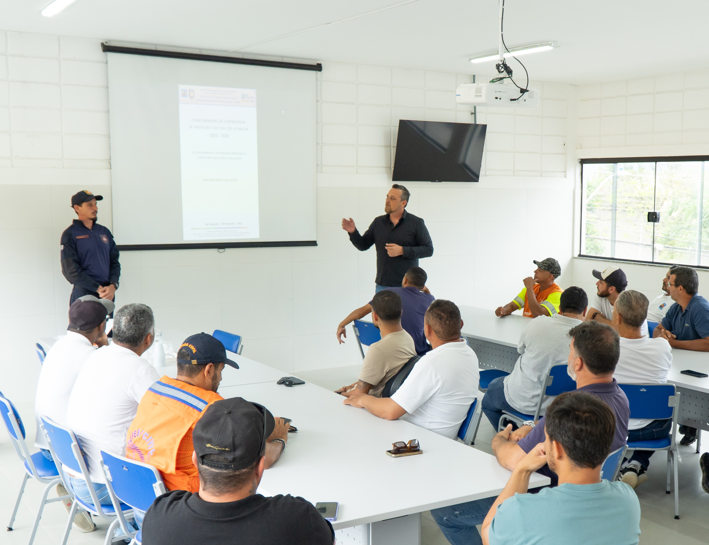 #PraTodosVerem: Em uma sala de reuniões iluminada, com mesas brancas e cadeiras azuis, servidores municipais participam de uma capacitação conduzida por integrantes da Defesa Civil de São Sebastião. As imagens mostram momentos de apresentação e diálogo entre os participantes, além de uma foto coletiva ao final do encontro, com os profissionais reunidos em frente à tela de projeção.