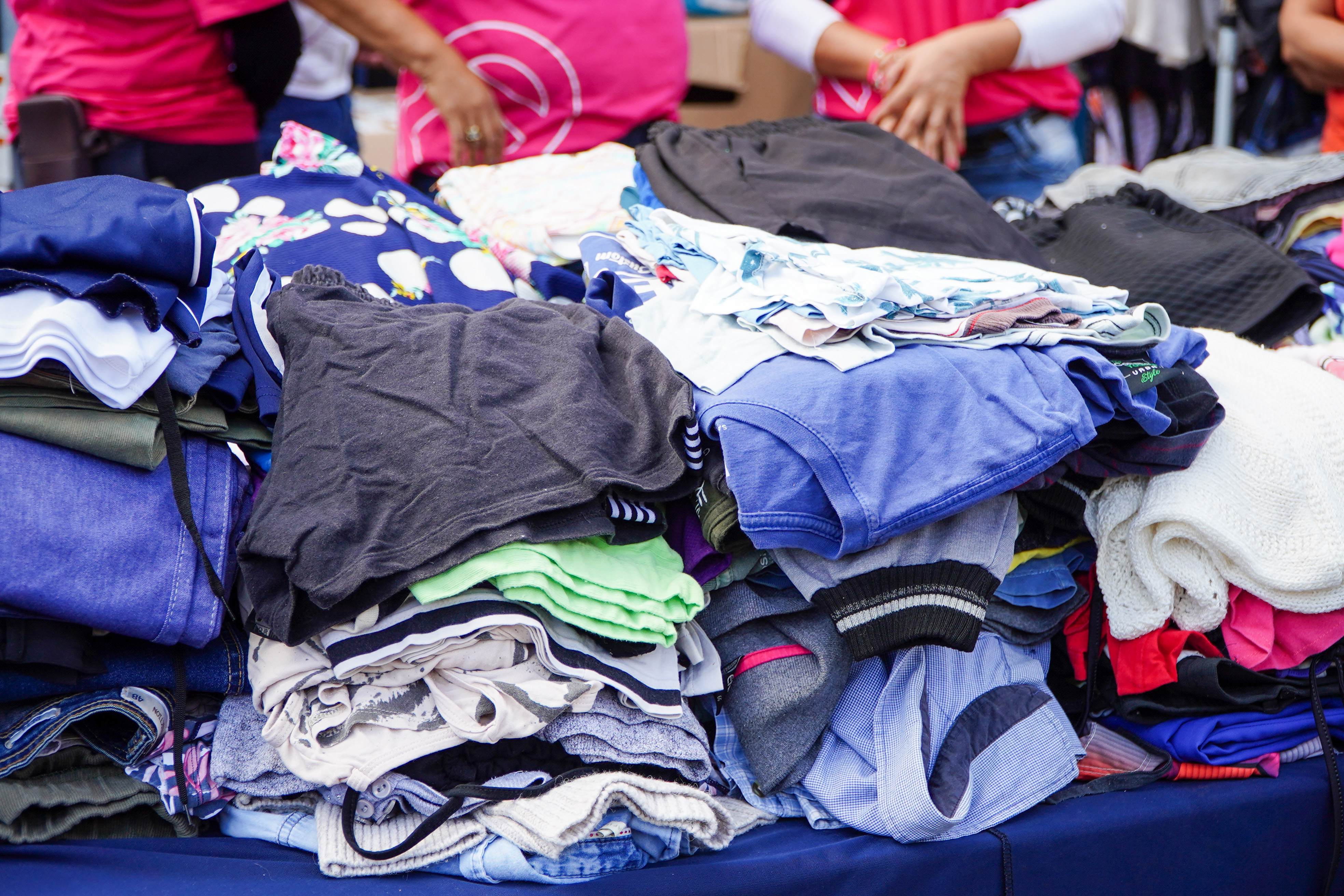 #PraTodosVerem: As imagens mostram ações do Varal Solidário. Na primeira, há uma grande variedade de brinquedos coloridos espalhados sobre uma superfície, incluindo bonecos, carrinhos, bichos de pelúcia e bonecas, com uma criança ao fundo. Na segunda, pilhas de roupas dobradas em diferentes cores e tamanhos estão sobre uma mesa, com pessoas ao fundo usando camisetas cor-de-rosa, organizando as peças. Fim da descrição.