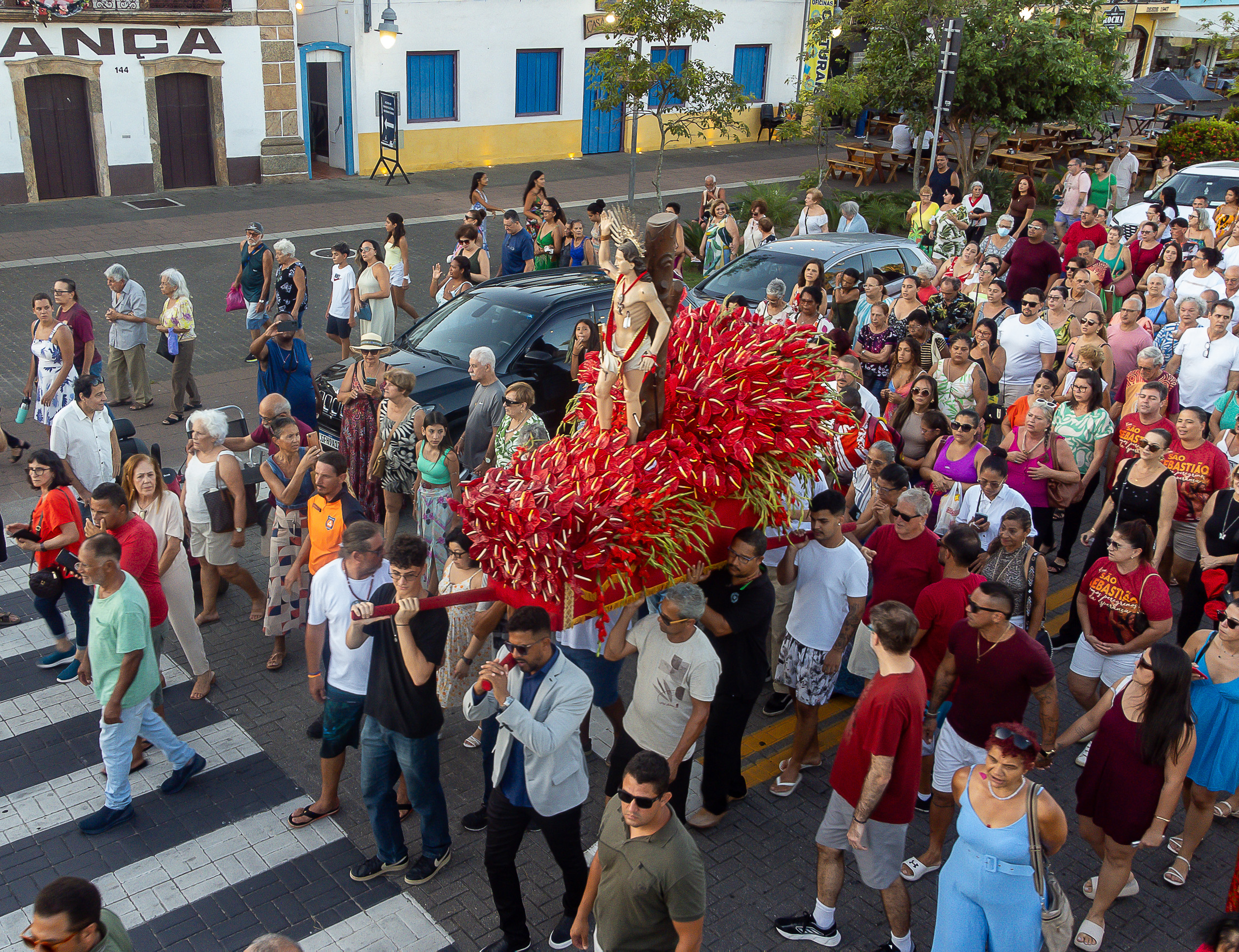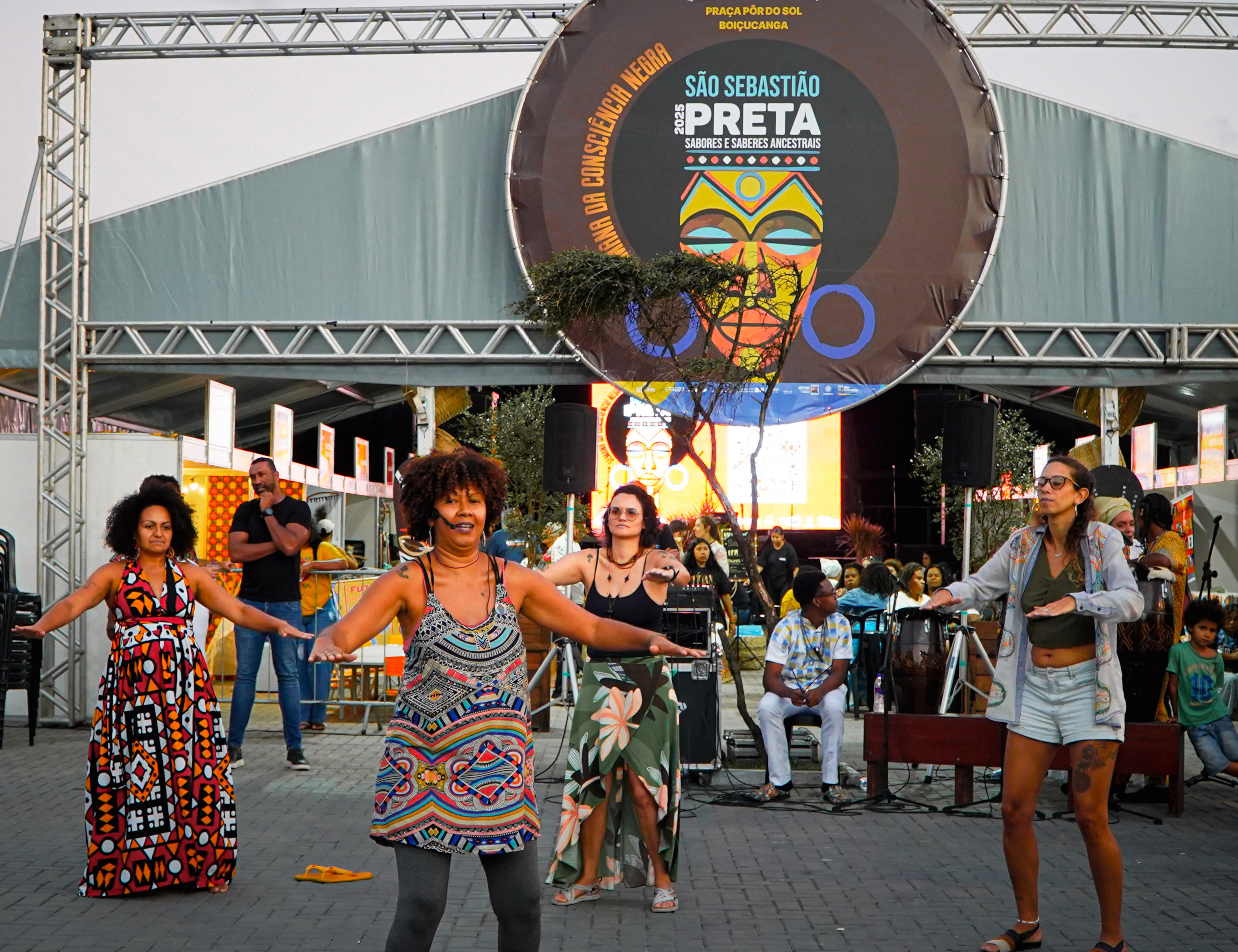 #PraTodosVerem: Imagens mostram uma procissão popular com andor de São Sebastião decorado; uma cerimônia cívica com pessoas alinhadas diante das bandeiras; e um evento cultural em praça, com mulheres dançando em frente a um palco que celebra a cultura negra, com público ao redor. Fim da descrição.