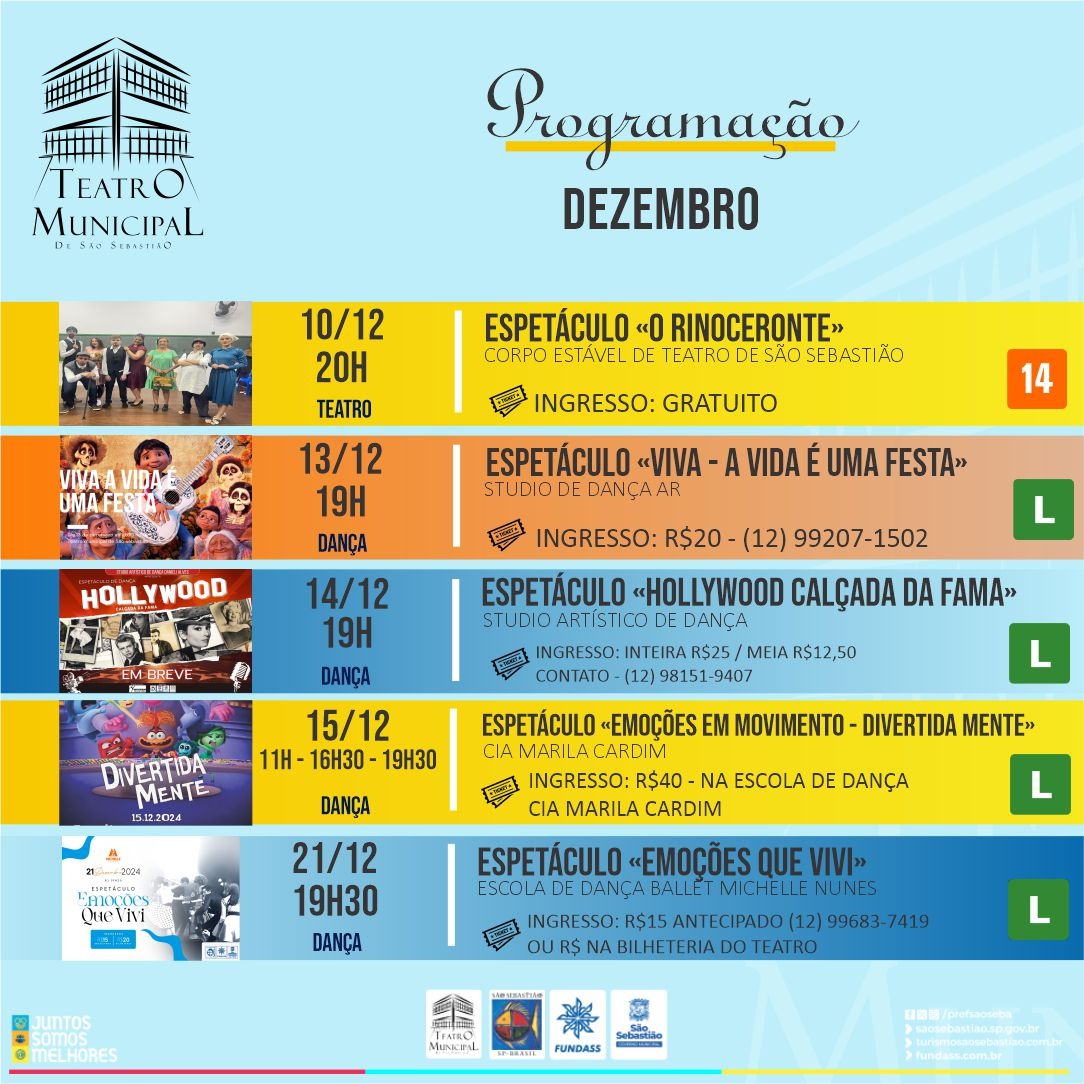 Durante o mês de dezembro, a Prefeitura de São Sebastião, por meio da Fundação Educacional e Cultural ‘Deodato Sant’Anna’ (Fundass), realizará uma extensa programação cultural no Teatro Municipal, apoiando diversas ações artísticas e fomentando a cultura no município.