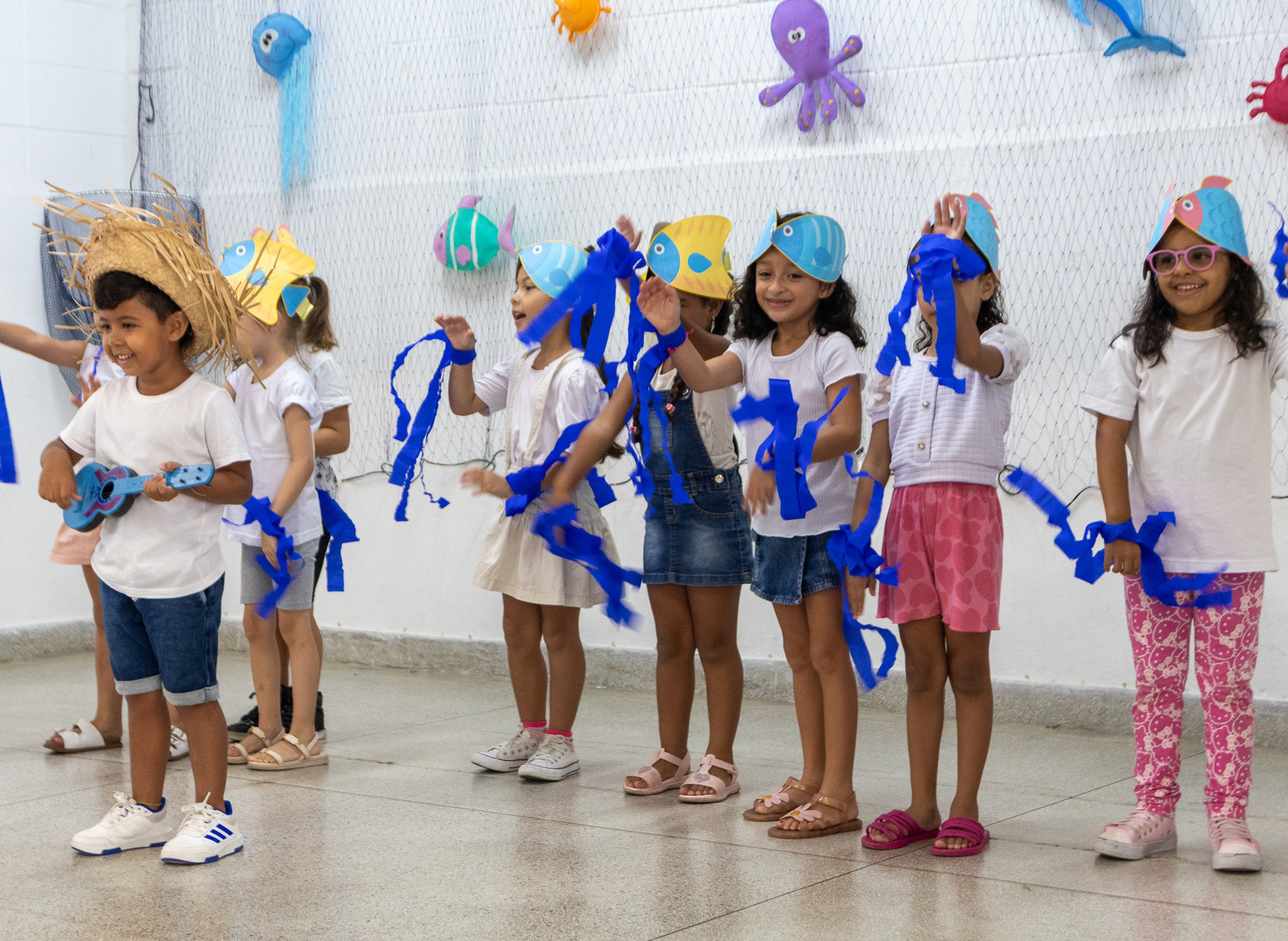 #PraTodosVeremEm uma arte de divulgação da 9ª edição da EXPOTEC 2025, aparecem informações sobre a Exposição Tecnológica, Educacional e Cultural que ocorre nos dias 5 e 6 de dezembro nas unidades escolares de São Sebastião; em seguida, há uma foto de um grupo de crianças e um adulto em uma bancada colorida com bananas e ingredientes, todos usando toucas e luvas, sorrindo enquanto seguram uma receita de doce de banana; depois, uma imagem mostra crianças pequenas acompanhadas por adultas em uma mesa repleta de materiais de artesanato, criando e manipulando objetos coloridos; por fim, a última foto apresenta um grupo de crianças alinhadas, usando adereços temáticos do fundo do mar, segurando fitas azuis e sorrindo enquanto realizam uma apresentação.