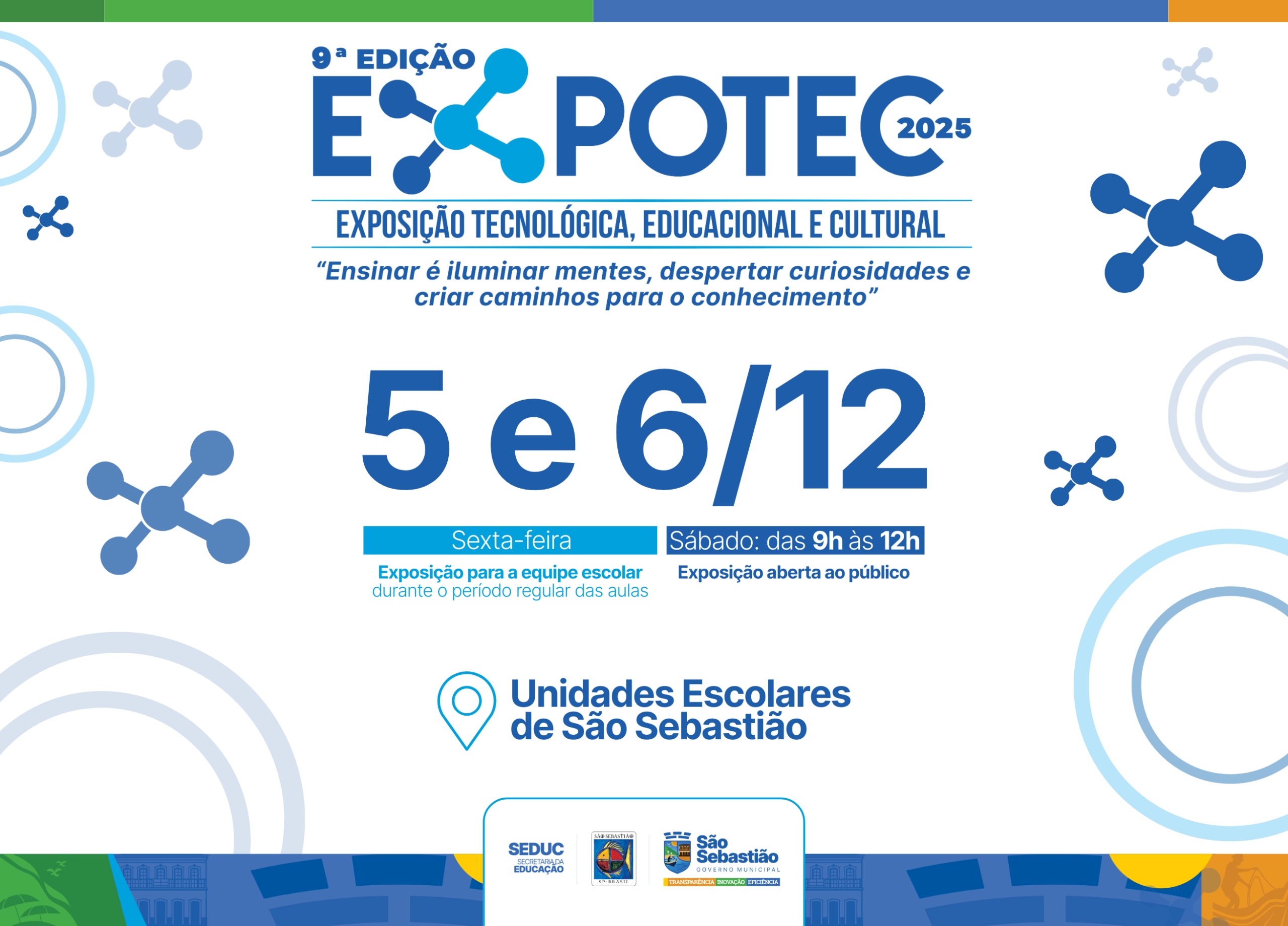 A Prefeitura de São Sebastião, por meio da Secretaria da Educação (Seduc), prossegue neste sábado (6) com a 8ª edição da Exposição Tecnológica, Educacional e Cultural (Expotec), que será realizada diretamente nas unidades escolares da rede municipal. Com o tema ‘Ensinar é iluminar mentes, despertar curiosidades e criar caminhos para o conhecimento’, o evento reforça a diversidade de saberes e vivências produzidos no ambiente escolar, estimulando oportunidades de aprendizagem com intencionalidade pedagógica e formativa.