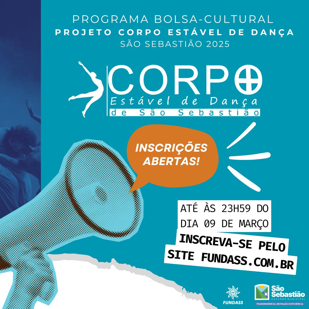 A Prefeitura de São Sebastião, por meio da Fundação Educacional e Cultural ‘Deodato Sant’Anna (Fundass), selecionará profissionais com conhecimento e experiência anterior na prática de dança, para compor o projeto. As inscrições são gratuitas e devem ser realizadas por meio do link https://fundass.com.br/edital-de-chamamento-publico-fundass-no-006-2025-programa-bolsa-cultural-projeto-corpo-estavel-de-danca-de-sao-sebastiao-2025/, até às 23h59 do dia 9 de março.